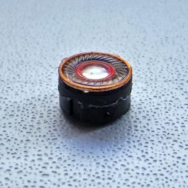 До динамика добраться удалось, но ценой полного разрушения корпуса. Его диаметр чуть менее 6 мм — для удобства будем считать, что шесть. Маркировок нет, выглядит как типичный излучатель в бюджетных наушниках.