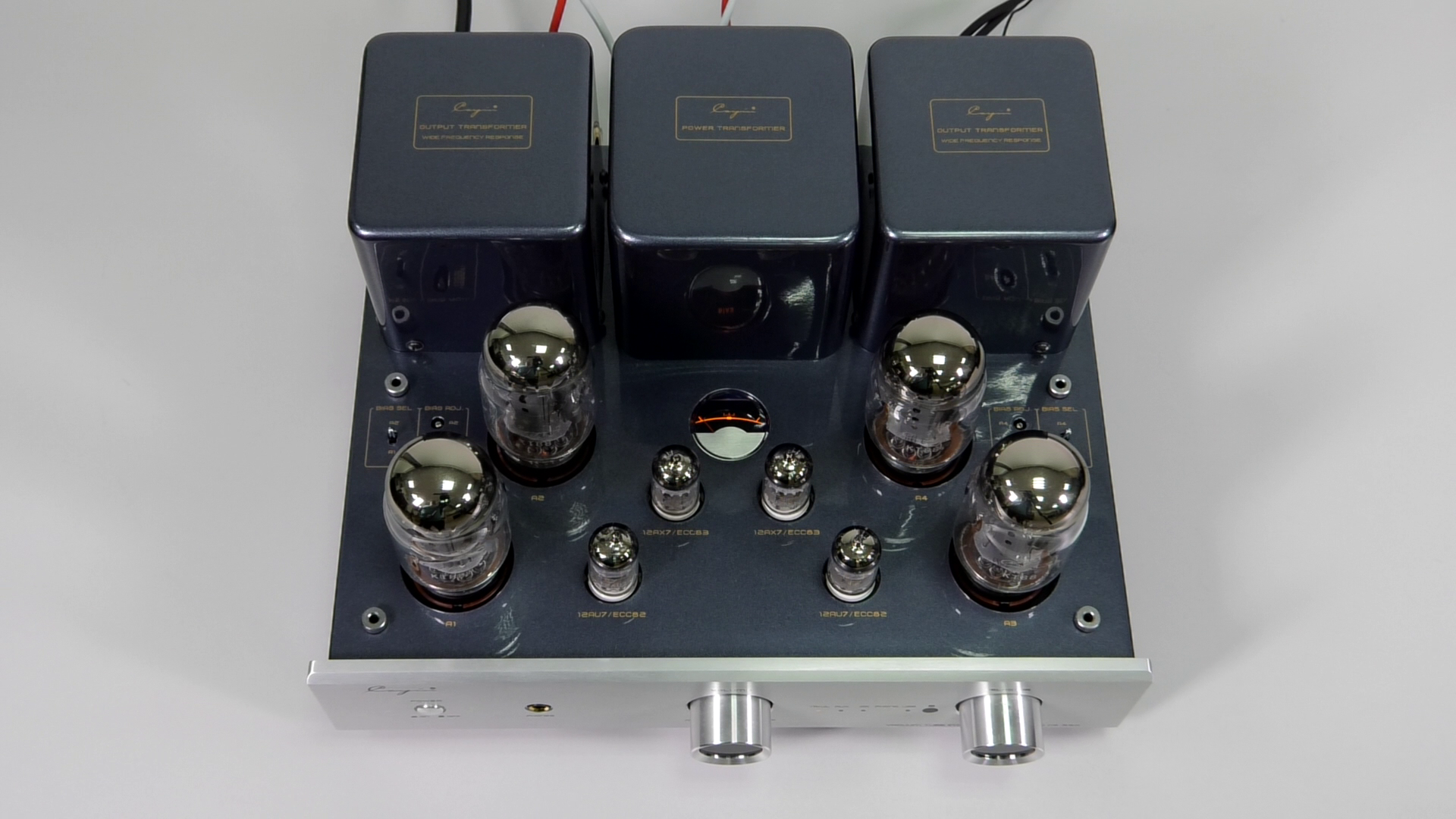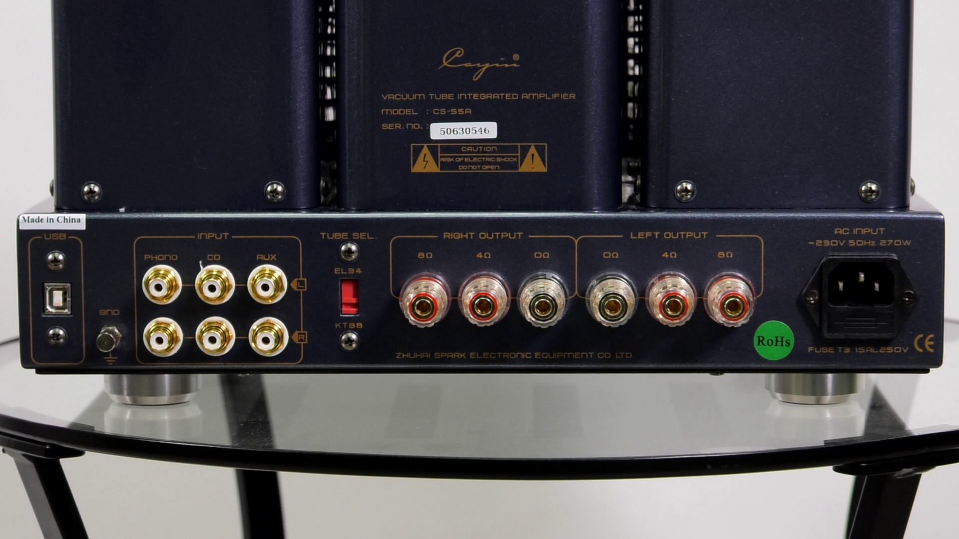 Усилитель Cayin CS-55A работает в классе АВ и оснащен четырьмя лучевыми тетродами KT88 в двухтактном включении. Интересной особенностью усилителя является наличие USB-входа, а также возможность работы в двух режимах: ультралинейном и триодном. По заявлениям производителя, ультралинейный режим «обеспечивает динамичную масштабную подачу», а триодный «позволяет получить более чистый, мелодичный и открытый саунд». В первом режиме мощность на канал составляет 40 Вт, а во втором — 22 Вт. В предварительной секции используются лампы 12AU7/ECC82 и 12AX7/ECC83. Для настройки токов смещения выходных ламп KT88 на верхней панели корпуса имеются винтовые регуляторы, Bias-селекторы и стрелочный индикатор. Усилитель оснащен асинхронным USB-портом и встроенным ЦАП. Обещана его работа с PCM-форматами до 32 бит/384 кГц. На борту также имеется встроенный усилитель для наушников с гнездом 6,3 мм.