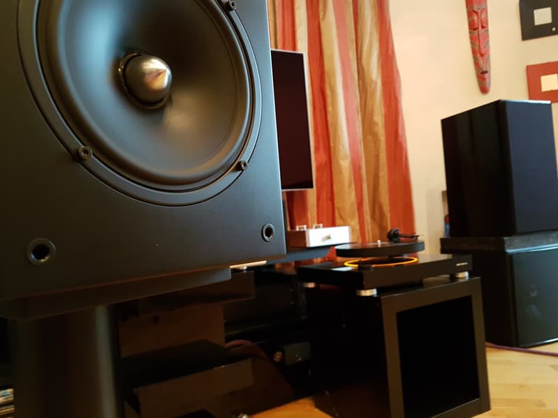 Перейдем к звуковым впечатлениям. Стойки Arslab ST6 приехали в компактном ящике с опалубкой, были собраны за 5 минут и установлены в двух метрах от фронтальной стены почти в центре комнаты площадью 26 м². Устанавливаю Arslab Classic 1.5 на стойки. Глубина колонок больше глубины стоек, но это не критично. Клеммная табличка на колонке гласит об импедансе акустики 6 Ом, клеммы на усилителе предлагают 2 варианта: 4 и 8 Ом. Подключаю к клеммам на 8 Ом. Mag-Lev Audio Ml1 подключаю к внешнему фонокорректору комплектным кабелем, а его, в свою очередь, подключаю в линейный вход усилителя. Ставлю пластинку на опорный диск и запускаю тонарм. Усилителю требуется около минуты на прогрев. В течение этого времени светодиод на регуляторе громкости мигает, никакие регулировки не работают, звук в колонки не поступает.