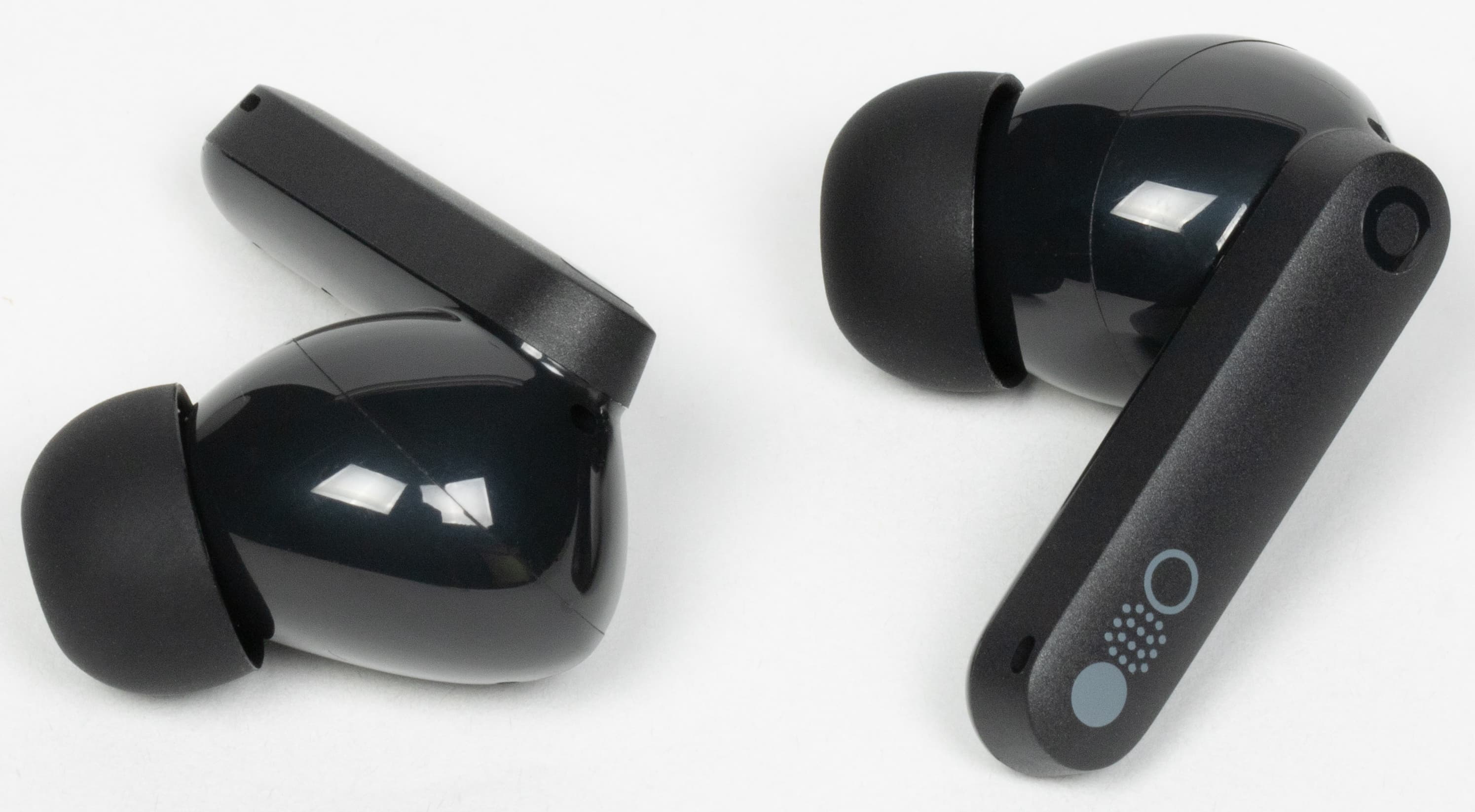 На внешнюю сторону «палочек» нанесен логотип производителя, а служащая для управления гарнитурой сенсорная зона выделена слегка выступающим над поверхностью округлым глянцевым элементом, который отлично определяется на ощупь.