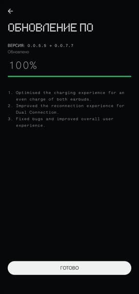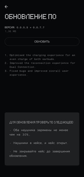Возвращаемся на главный экран. Тут можно увидеть зарядку отдельно каждого из наушников, а также кейса, это удобно. На странице настройки приложения можно посмотреть версию прошивки, изменить цветовую схему и настроить уведомления. Там же доступна всяческая дополнительная информация — от пользовательского соглашения до лицензий. По тапу на иконку шестеренки в правом верхнем углу открывается меню настройки устройства, в котором есть масса всего интересного — на нем остановимся поподробнее.