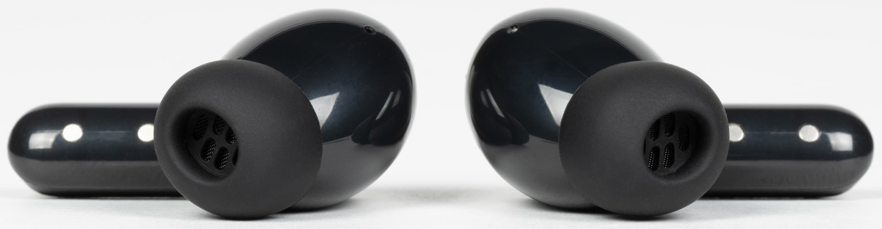 Насадки выполнены из мягкого и приятного на ощупь силикона, внутреннее отверстие прикрыто сеточкой, предотвращающей проникновение загрязнений в звуковод.