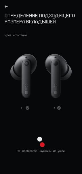Сервис определения качества посадки и «подходящести» размера вкладышей работает стандартным образом: динамики наушников воспроизводят специальный сигнал, а внешние микрофоны пытаются его уловить. Если у них это получается, значит, уровень утечек слишком велик, наушники сидят плохо, есть смысл сменить силиконовые насадки. Мы протестировали работу системы, чуть ослабив крепление правого наушника — приложение тут же нам об этом сообщило.