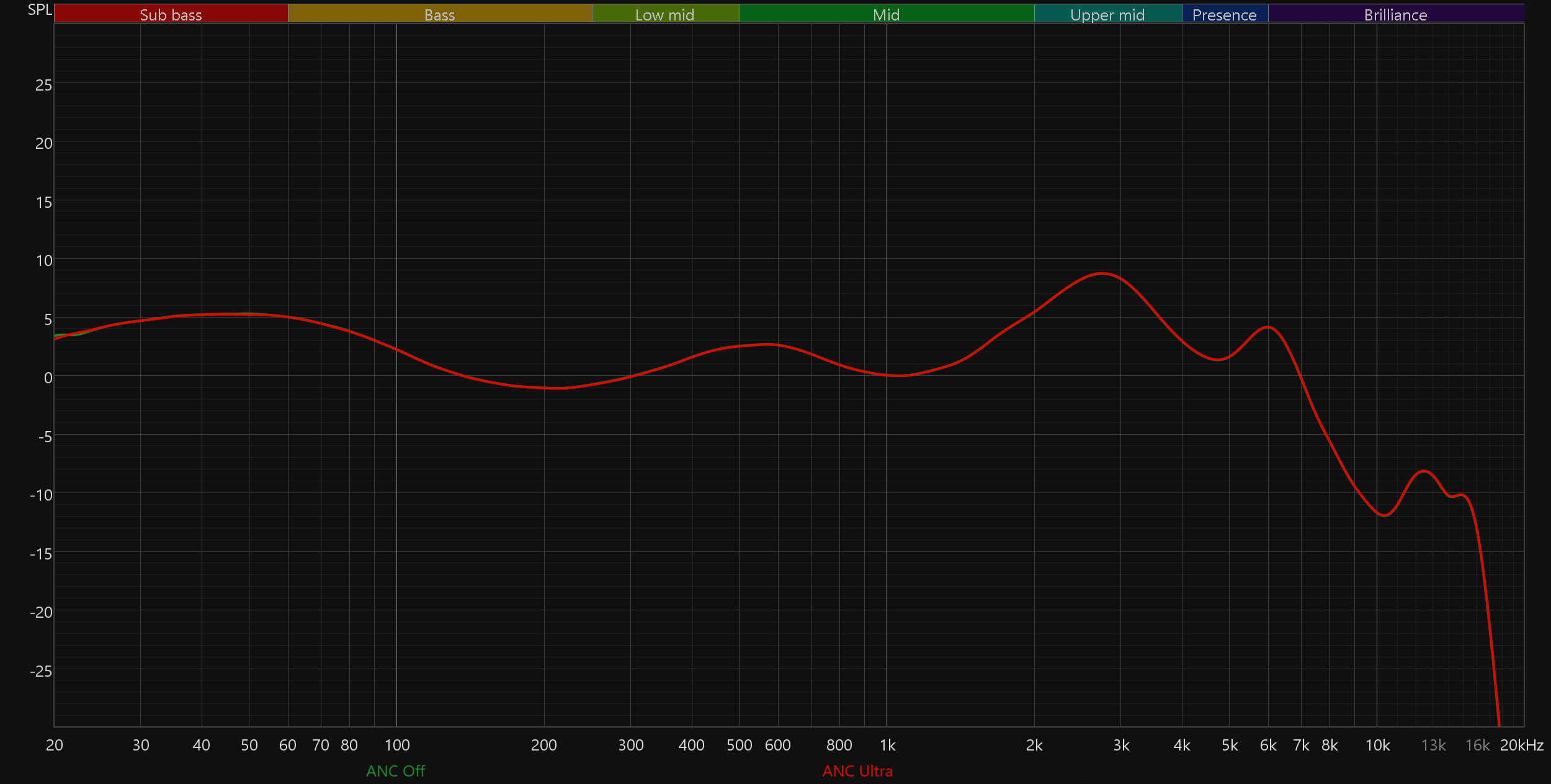 Система активного шумоподавления не блещет эффективностью, зато и на звучание влияет минимально: графики до и после ее задействования полностью совпали.