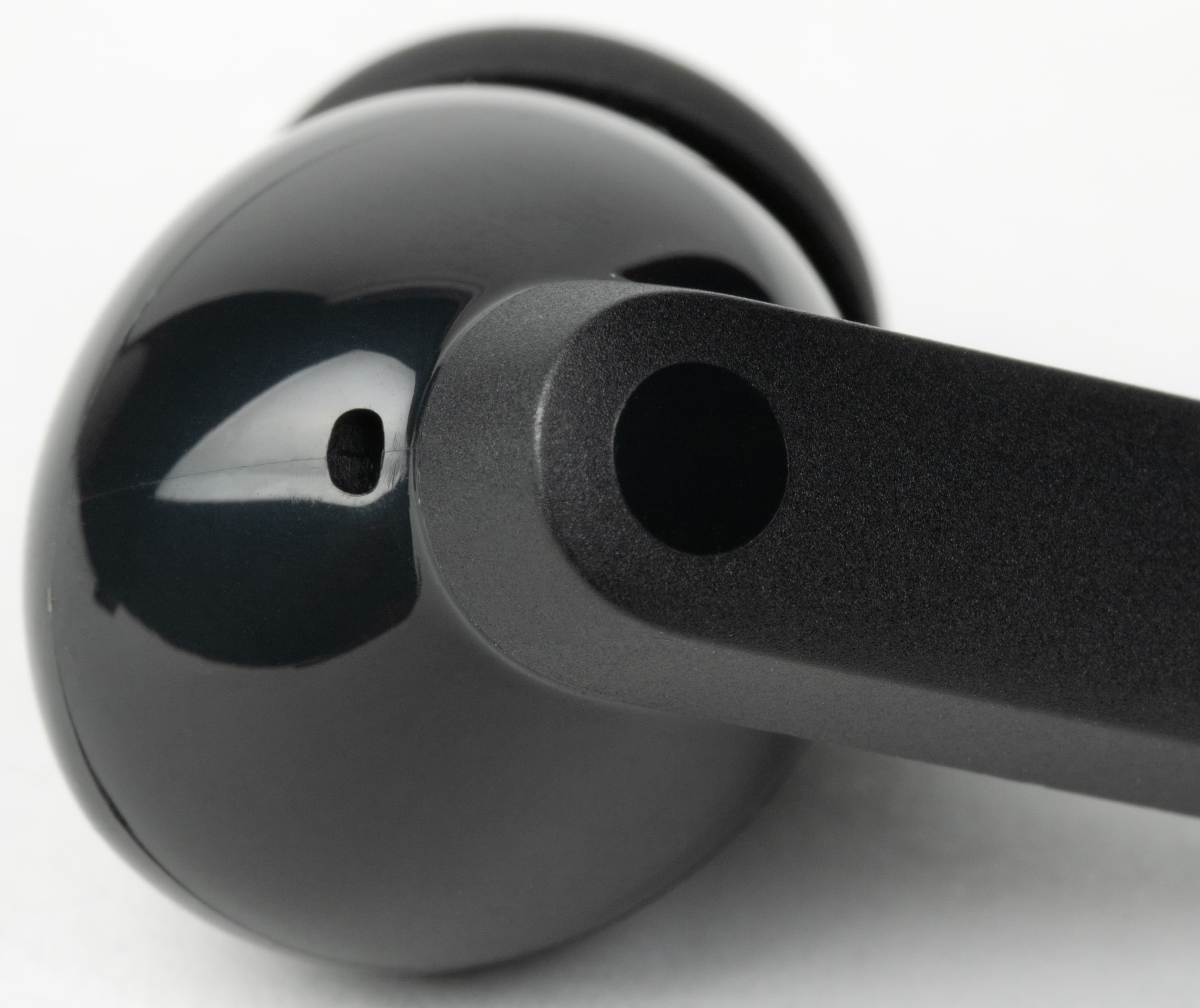 Отверстие внешнего микрофона гибридной системы активного шумоподавления размещено чуть выше основания «палочки» на округлой части.