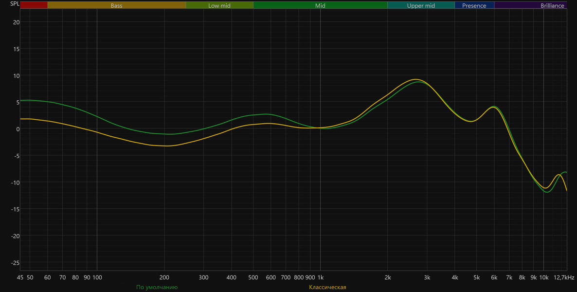 Средние частоты подаются немножко своеобразно — с выделенной нижней их частью, что немного подчеркивает вокал и повышает субъективно воспринимаемую «естественность» подачи музыкального материала. Высокие частоты очень хорошо уложены в общий тональный баланс — читаются, но при этом звучат не слишком резко и лишены характерных для них проблем. Традиционно проиллюстрируем сказанное с помощью графиков АЧХ. Начнем с того, что получен при использовании кодека LDAC.
