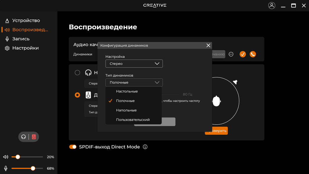 Правее мы видим крупную ручку регулятора громкости — потенциометра с ограничением угла вращения. Работает он не менее мягко и приятно. Громкость можно также изменять из приложения Creative App, передвигая соответствующий «ползунок». Если после этого вновь воспользоваться ручкой на панели управления — его положение сразу «прыгает» на соответствующее значение.