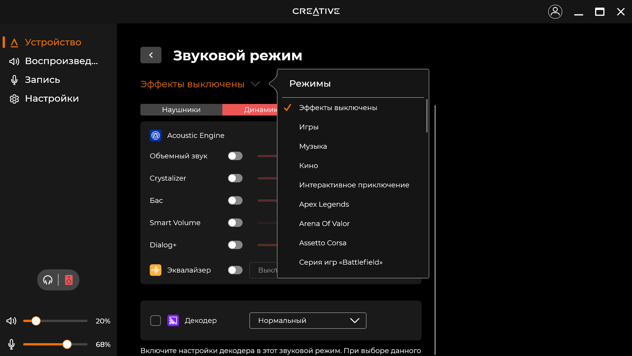 С помощью ПО Creative App пользователи могут получить доступ к огромному количеству настроек звучания устройства: от полноценного 10-полосного эквалайзера со множеством готовых пресетов (в том числе — под ряд популярных игр) до режима Scout Mode, в котором устройство усиливает критически важные звуковые сигналы в играх, такие как шаги. Для микрофонов тоже предусмотрен целый ряд настроек, включая систему шумоподавления и собственный эквалайзер. Так что стримерам и создателям контента есть на что посмотреть. Стоит заметить, что у «аудиофильской» Sound Blaster X5 эти возможности также доступны — производитель не стал ограничивать использование «игровых» функций в «неигровом» устройстве, за что ему отдельный респект.