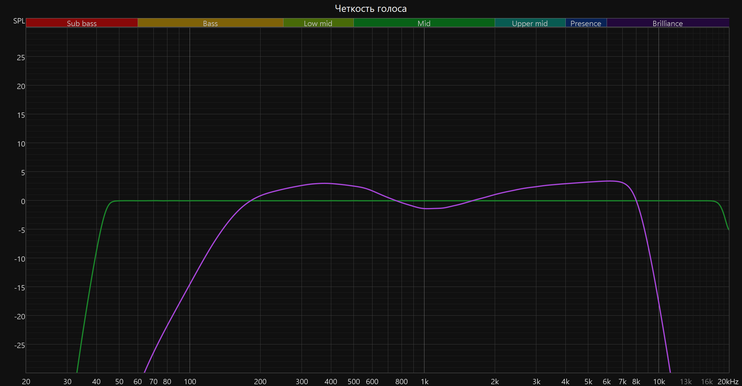Последние два пресета изначально рассчитаны на «изменение высоты тона» и вряд ли могут рассматриваться как регулярно используемые. А вот остальные делают примерно одно и то же. Первым делом они «отрезают» частоты ниже где-то 200 Гц — это стандартное решение в случае микрофонов для голосовой связи, позволяющее радикально избавиться от низкочастотных шумов и «гулкости», практически не потеряв в разборчивости речи. СЧ-диапазон в районе 1 кГц уводится назад, чтобы избавиться от возможного «телефонного эффекта».