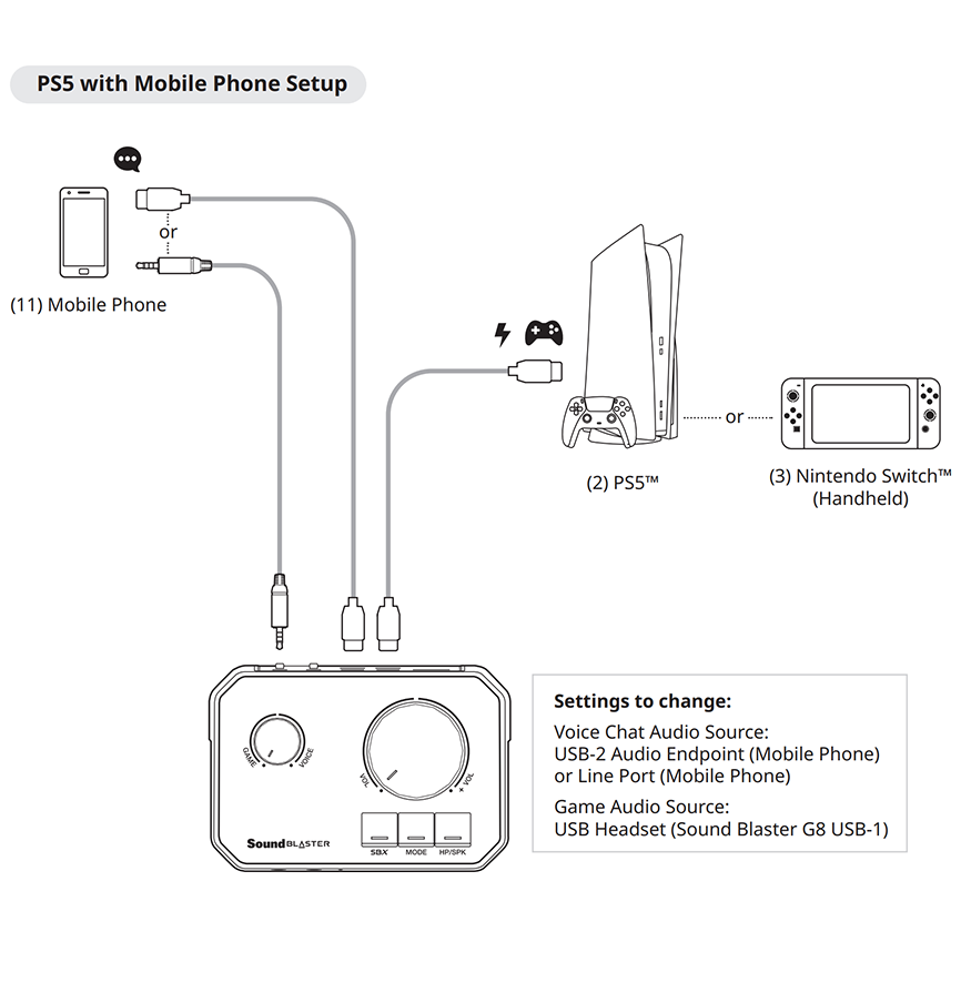 При этом нужно учесть, что второй порт «урезанный» — максимальное поддерживаемое разрешение там 24 бит/96 кГц и нет Direct-режима. Еще одна важная деталь: через первый USB осуществляется питание устройства, соответственно, если сценарий эксплуатации не подразумевает его использование (а есть и такие варианты), к нему будет необходимо подключить блок питания. Вновь обратимся к иллюстрациям из инструкции, где показаны различные комплекты оборудования и способы взаимодействия Sound Blaster G8 с ними.