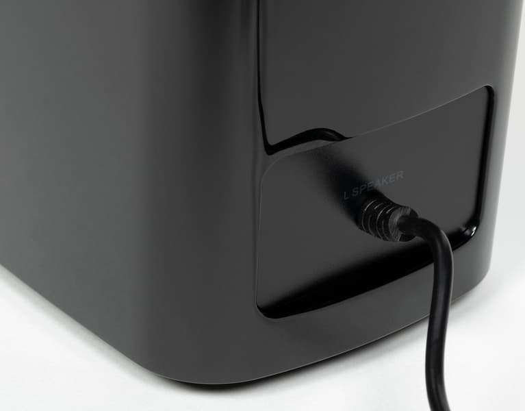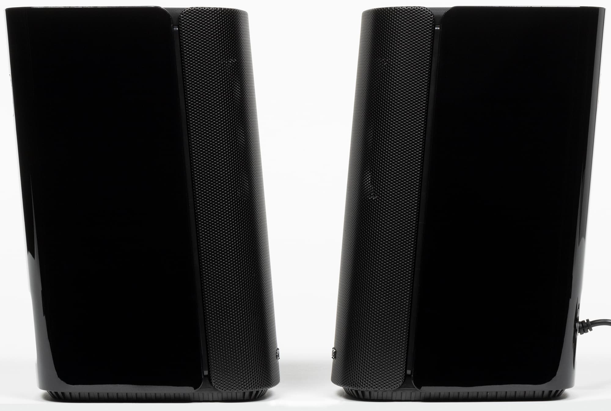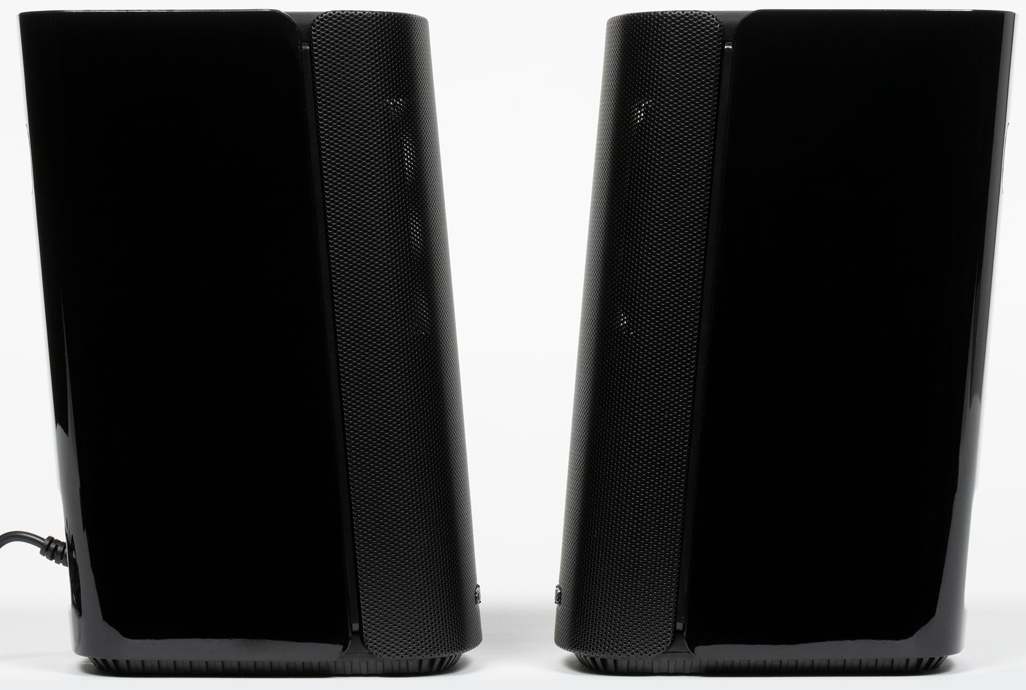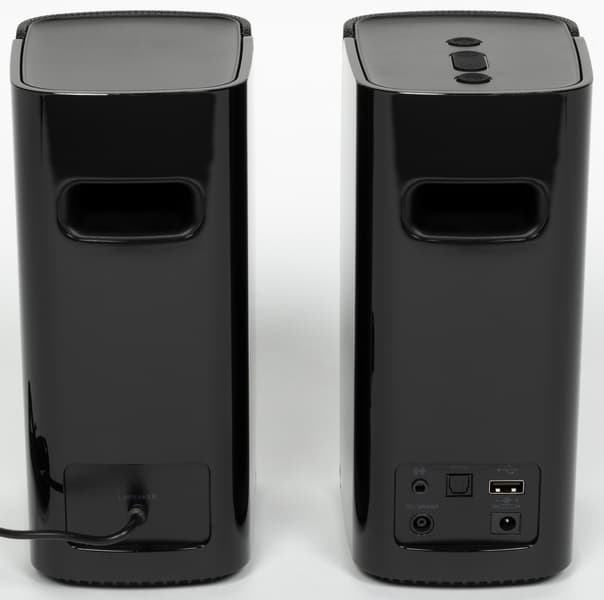 На задней панели активной колонки находятся разъемы для подключения, у пассивной на этом месте размещено крепление несъемного кабеля для подключения к активной. Его длина — 2 метра, что позволяет широко расставить колонки на столе для получения выраженного стереоэффекта.