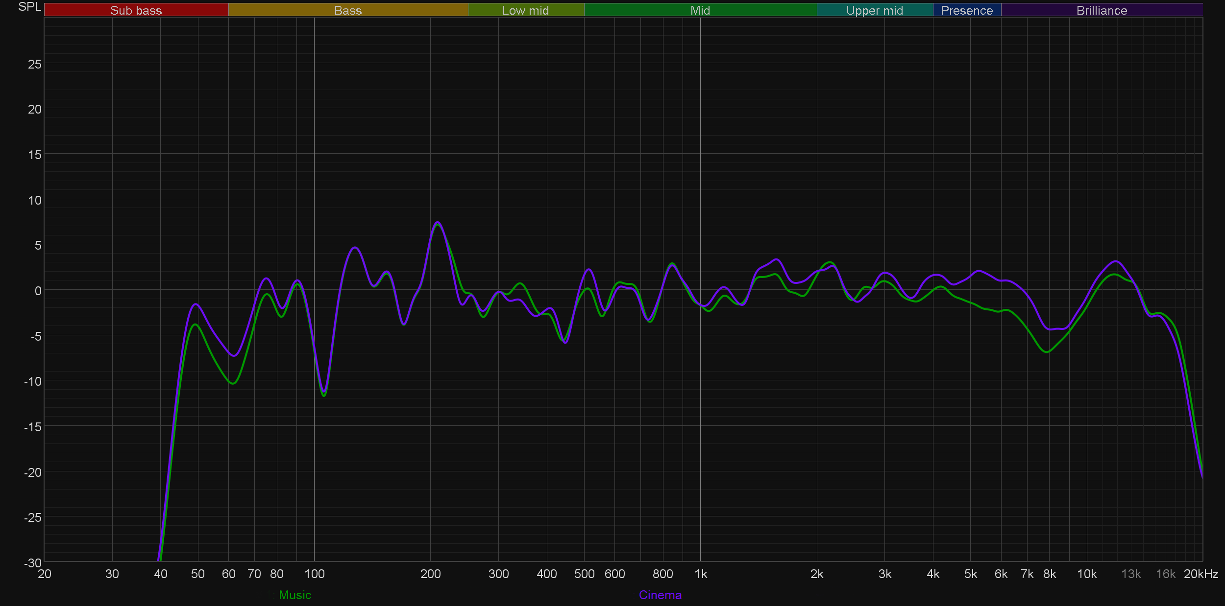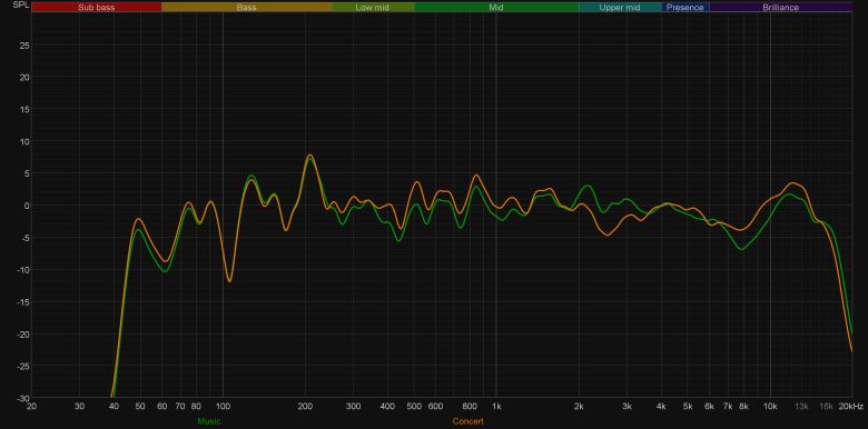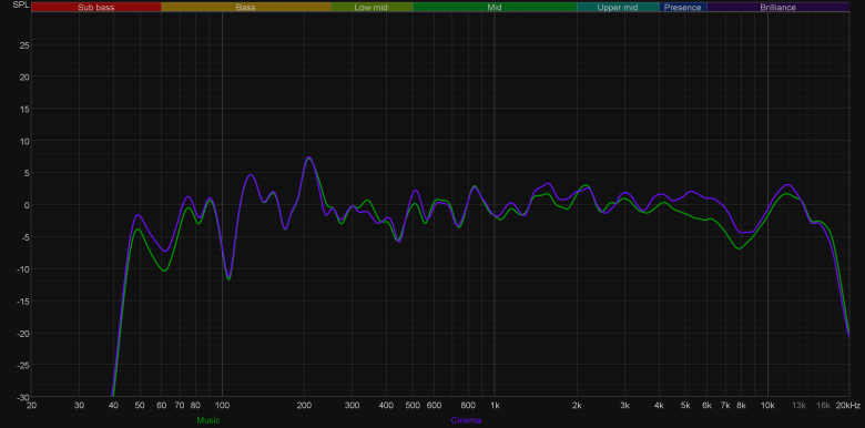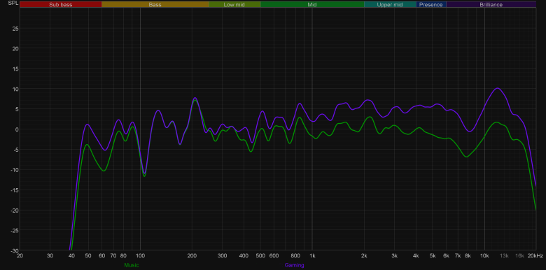 Встроенные пресеты эквалайзера работают, но крайне деликатно: как именно — видно на графиках. Выделить тут стоит лишь пресет Game, который основательно подчеркивает середину и верхние частоты. На нем, кстати, иногда приятно бывает послушать какую-нибудь камерную музыку с яркими вокальными партиями — звучит интереснее, чем с установкой Music, активируемой по умолчанию.