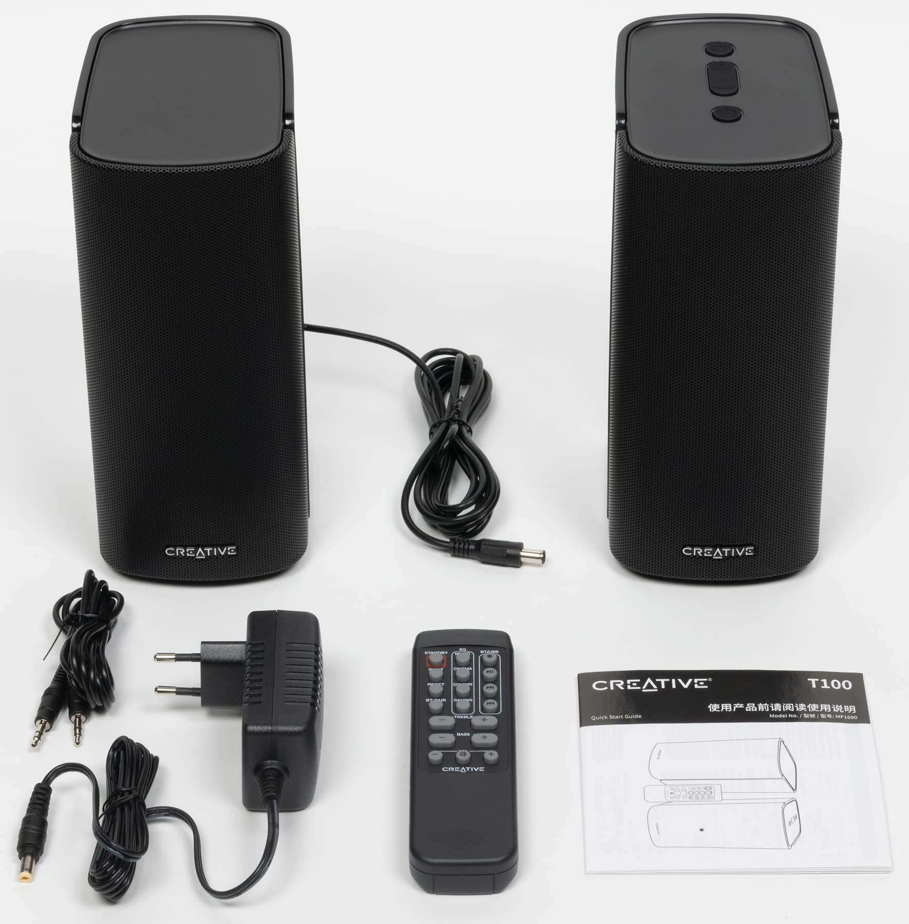В комплект входят пассивная и активная колонки, пульт дистанционного управления, инструкция, блок питания и кабель миниджек—миниджек для проводного подключения к источнику сигнала.
