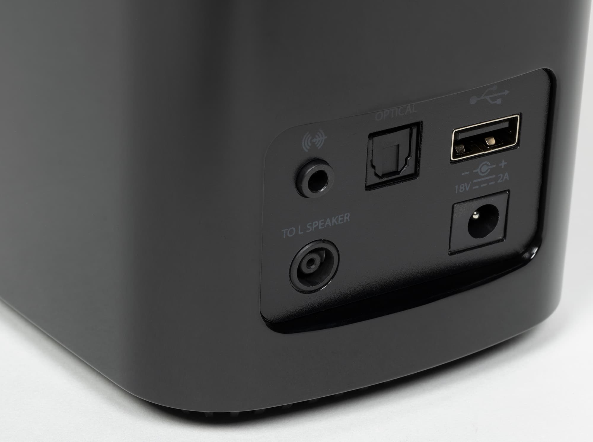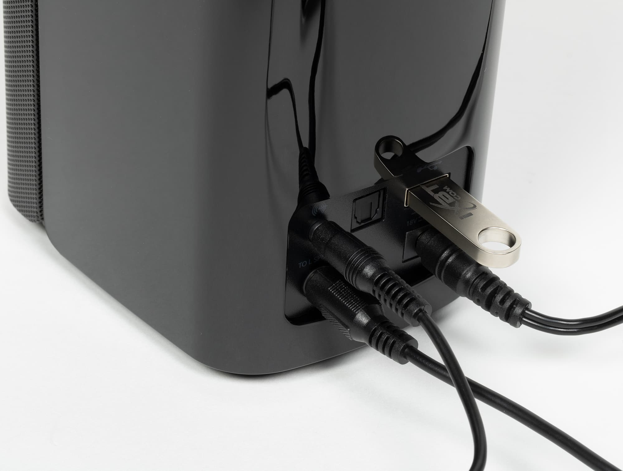 Сверху размещены три разъема для подключения источника звука: миниджек для аналогового сигнала, оптический разъем для цифрового, ну и USB-A для накопителей с аудиофайлами. Кабель для аналогового подключения есть в комплекте, а вот оптический придется докупить самостоятельно. Разъемы расположены очень компактно, но даже если подключить все кабели, они не мешают друг другу.