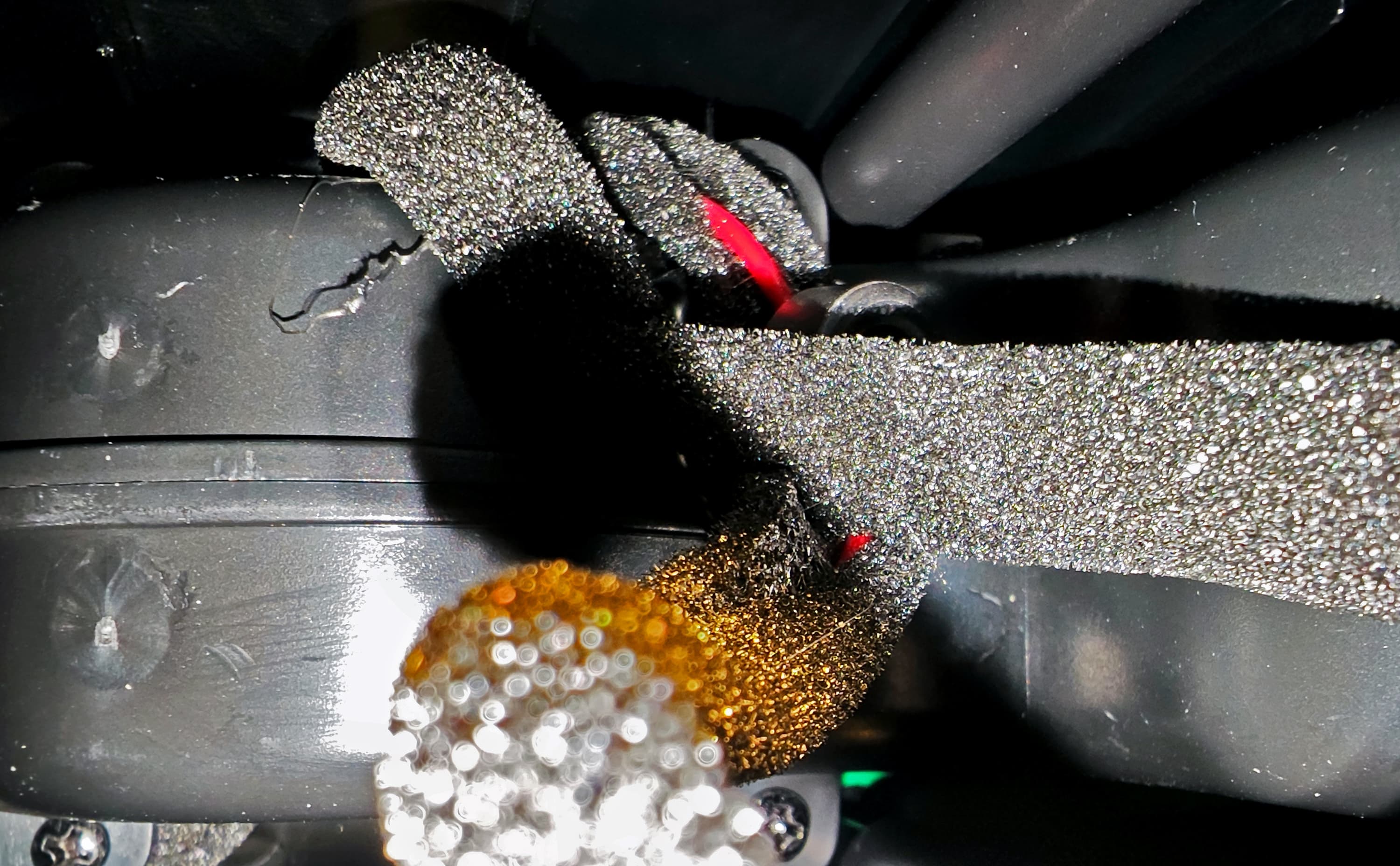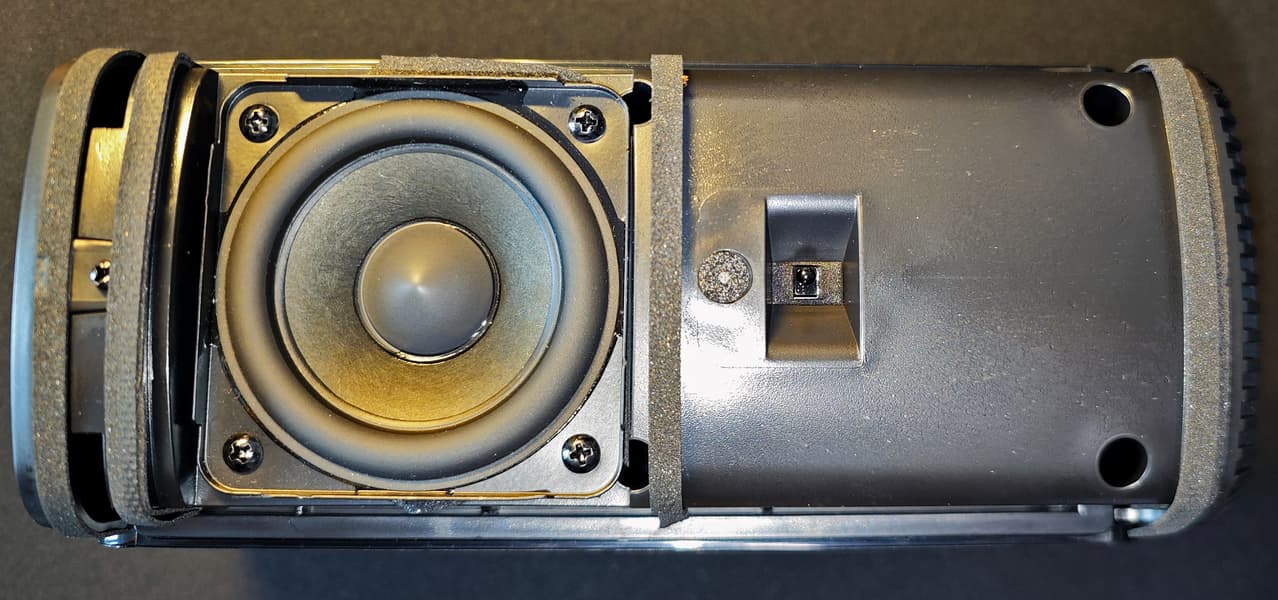 Демонтируем динамик — заглядываем внутрь. Видим, что кабели обернуты поролоном, а вот мягкого наполнителя во внутреннем пространстве колонки нет.