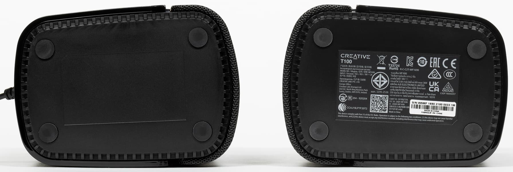 На дне активной колонки размещена наклейка с техническими данными об устройстве и логотипами систем сертификации. У обеих колонок есть по четыре маленьких силиконовых ножки, обеспечивающих их надежное размещение на столе и поглощающих маленькую часть нежелательных вибраций при работе.