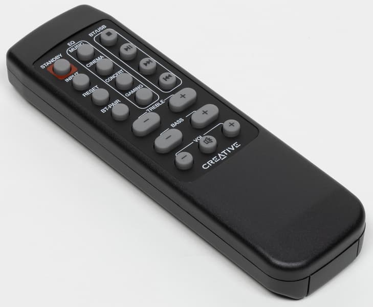 Управление Creative T100 можно осуществлять с помощью клавиш на верхней панели. Но только базовое: включить-выключить, выбрать вход, изменить громкость. Для остального понадобится пульт дистанционного управления.