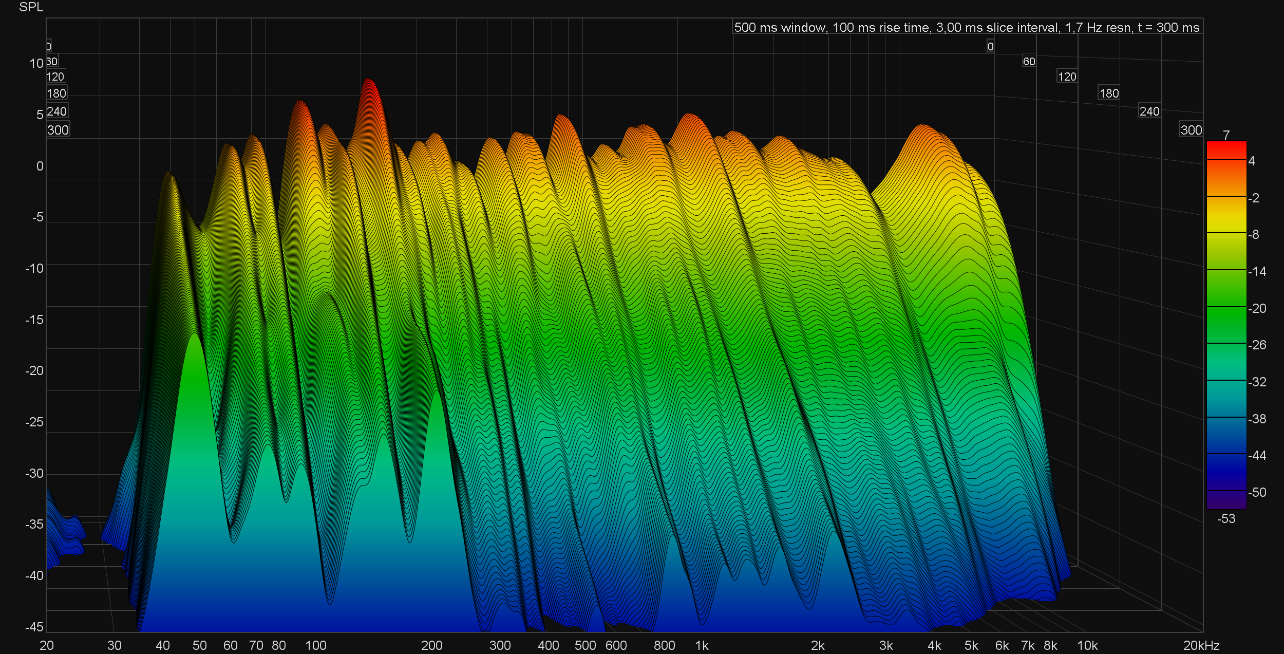 Графики почти полностью совпали, так что при выборе типа подключения следует руководствоваться в первую очередь удобством эксплуатации. Что же касается «гулкости» баса, то она прекрасно видна на графике кумулятивного затухания спектра (он же «водопад» или waterfall). При этом «гудение» присутствует не только в низкочастотном диапазоне, но и в средних частотах. Опять-таки нельзя забывать, что мы имеем дело с маленькими пластиковыми колонками.