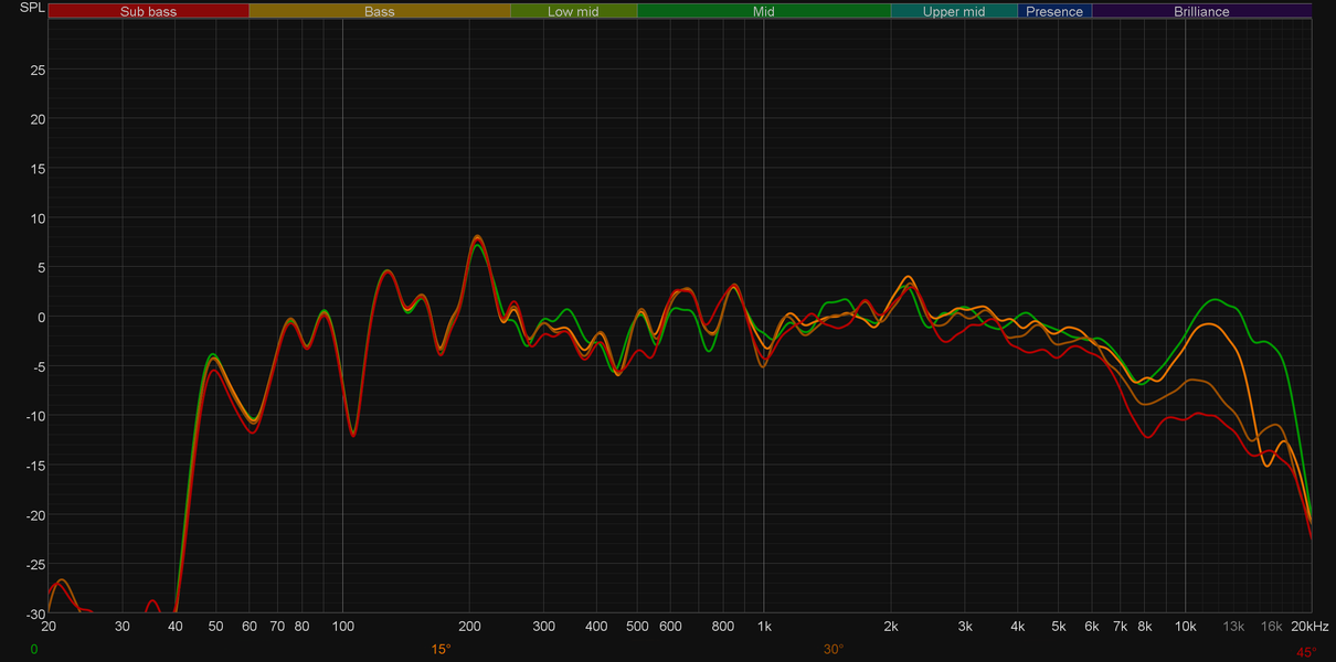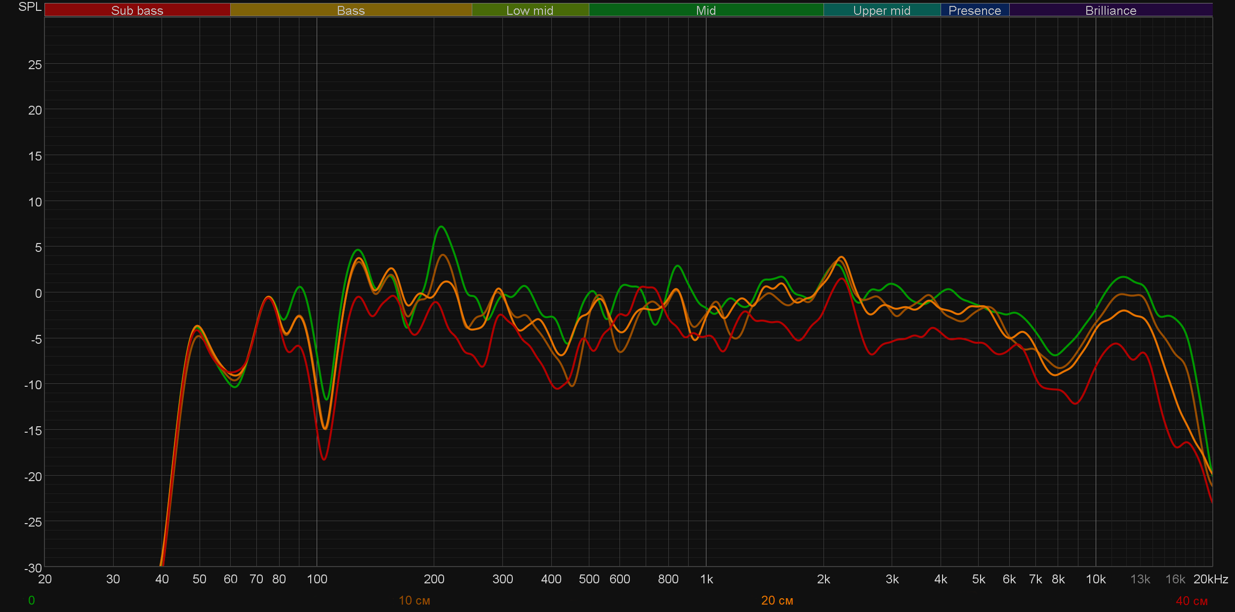 Еще важнее размещать колонки на уровне головы слушателя, что прекрасно видно по графикам ниже. Особое внимание стоит обратить на красный, полученный при размещении измерительного микрофона на 40 см выше колонок — как раз примерно там, где находится голова слушателя, если просто поставить их на стол. Так что немного поднять их лишним точно не будет.