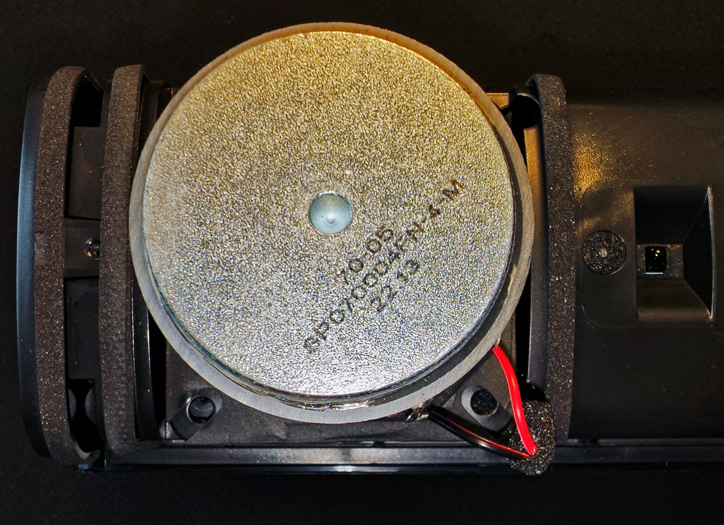 Как уже говорилось выше, собраны колонки на совесть. И это в целом хорошо, но разобрать их не так-то просто. Тот самый случай, когда крепежные элементы вроде и на виду... Но после их демонтажа корпус и не думает разбираться — видимо, удерживается на защелках, о расположении которых в курсе лишь его создатели. А потому разобрать устройство, конечно, можно. Но шансы сделать это, не повредив корпус, далеко не так велики, как хотелось бы. Но всё же посмотрим на то, до чего удалось добраться. Решетка надежно удерживается в пазах на передней панели, но более-менее легко снимается. Под ней обнаруживается единственный динамик диаметром 7 см. Ниже видны светодиодный индикатор и окошка приемника ИК-сигнала от пульта дистанционного управления.