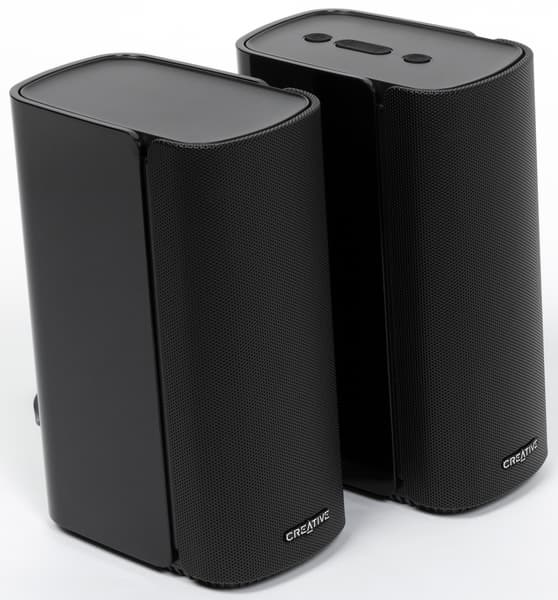 При взгляде сбоку видно, что корпус колонок чуть наклонен назад. И это прекрасно, так как позволяет направить звук от динамика в сторону головы слушателя при размещении Creative T100 на рабочем столе.