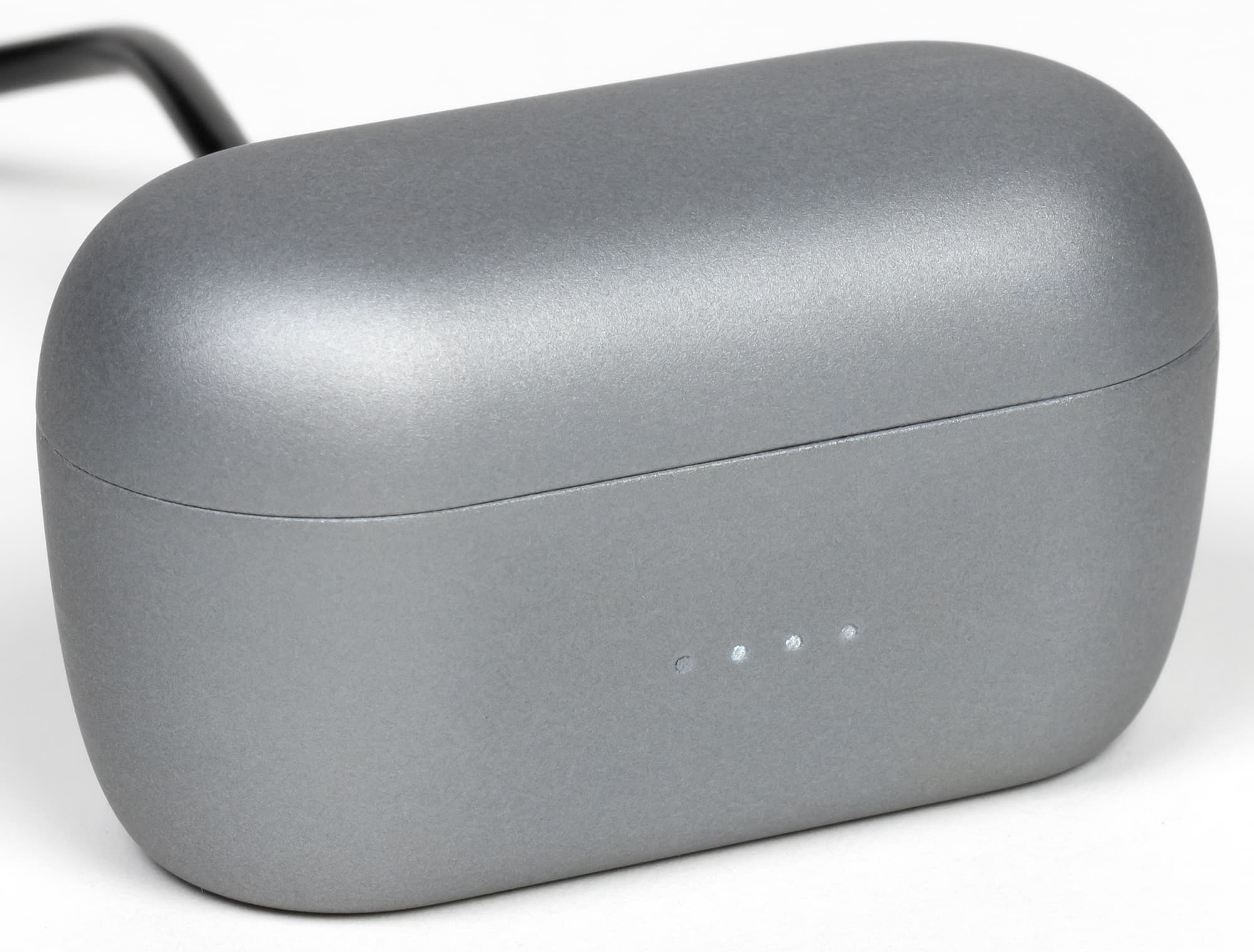 Кейс очень компактный, все края округлые — он легко помещается в карман средних размеров и не мешает при ходьбе. На лицевой панели расположены четыре светодиода, показывающие уровень зарядки встроенного аккумулятора: если все — 100%, три — 75%, два — 50% и один — 25%.