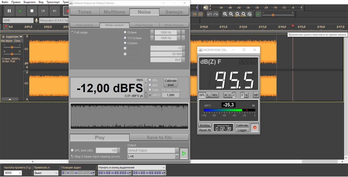 Безопасным уровнем звукового давления при прослушивании музыки в наушниках считается 75 дБ, но на практике большинство слушателей предпочитает уровень в районе 90-100 дБ. Мы транслируем в наушники белый шум, фиксируя уровень SPL в районе 95 дБ, сразу после старта воспроизведения запускаем запись сигнала с измерительного стенда — по длине получившегося трека легко понять, сколько проработал каждый из наушников.