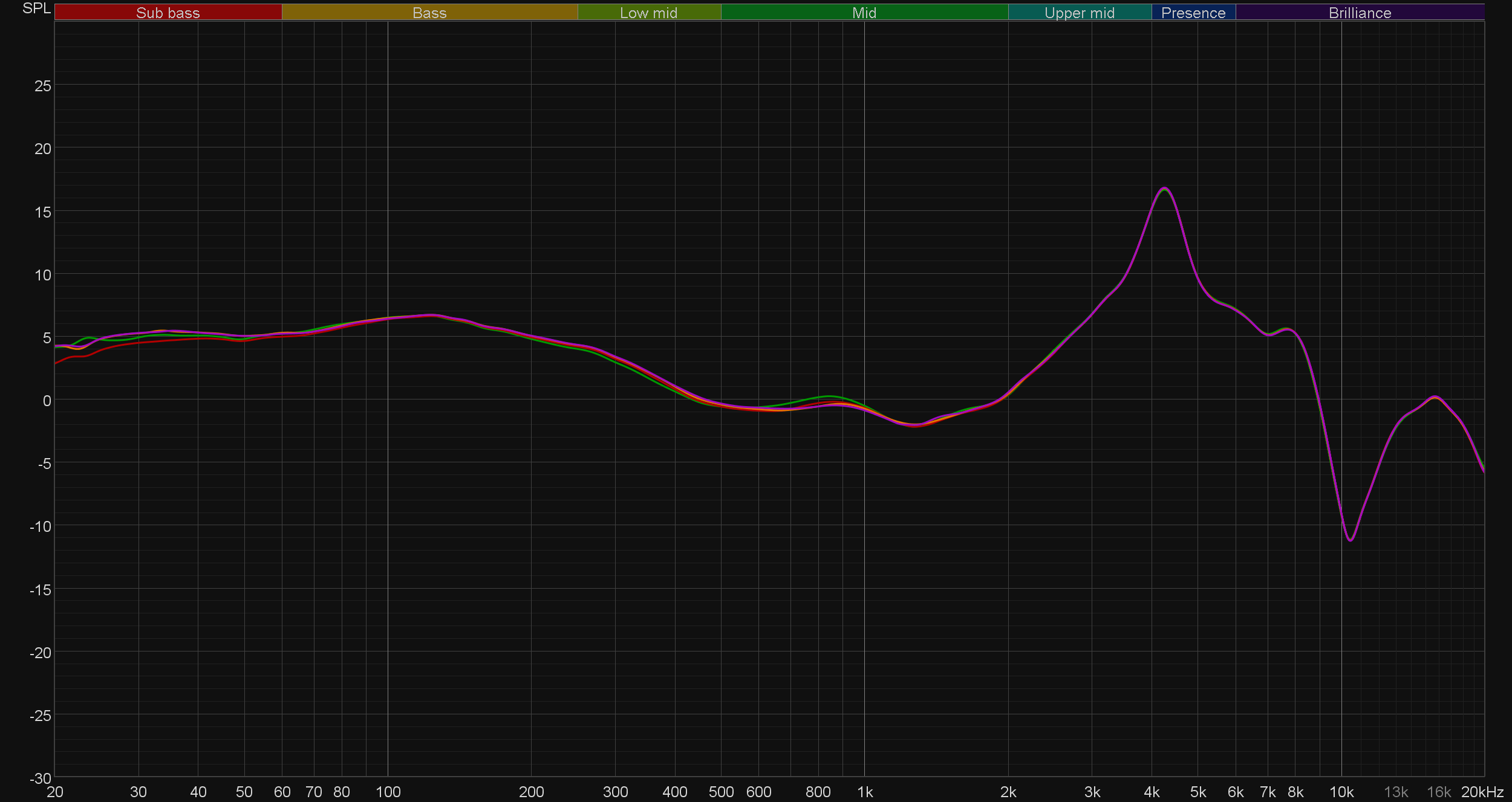 Как видно, графики практически полностью совпали, чего и следовало ожидать — нет смысла даже подписывать, где какой. Небольшие различия, конечно, имеются. Но связаны они больше с погрешностями измерений и тем, что наушники не были накрепко приклеены к стенду — при реальном прослушивании подобные изменения можно получить, просто пару раз повернув голову.