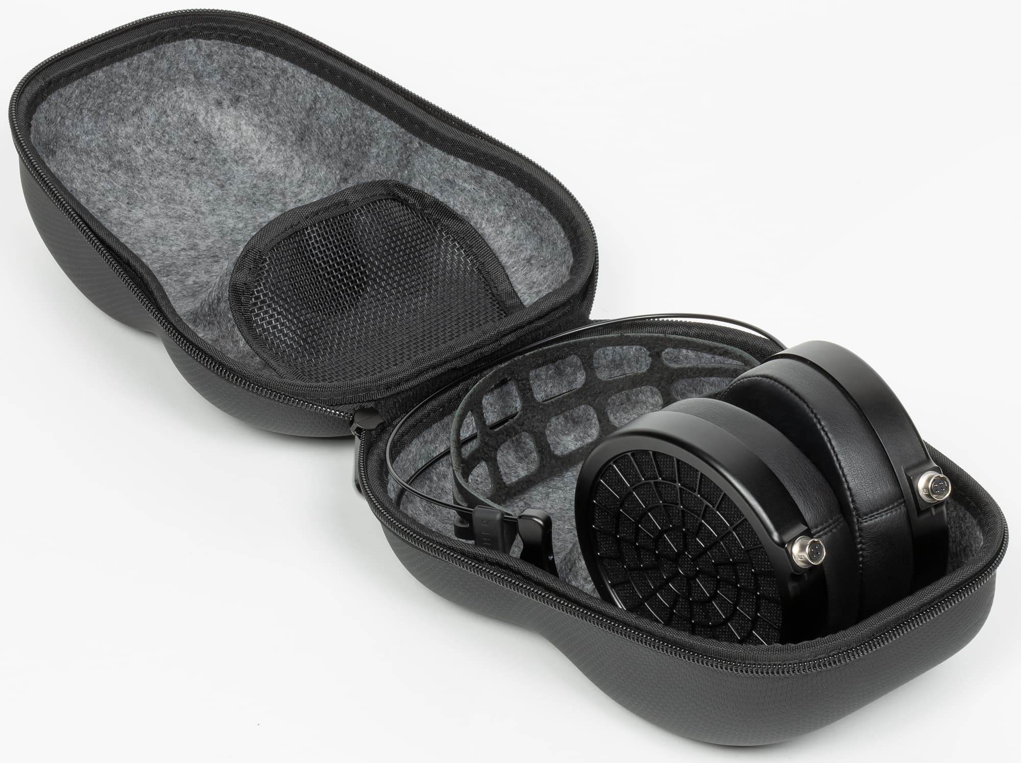 Упакованы наушники в черную коробку из плотного картона со съемной крышкой. На верхнюю часть нанесены схематичное изображение наушников и название модели. Более никаких декоративных элементов или надписей — все максимально просто и строго. Внутри коробки наушники помещены в комплектный кейс, обеспечивающий их сохранность при транспортировке.