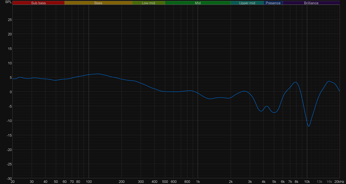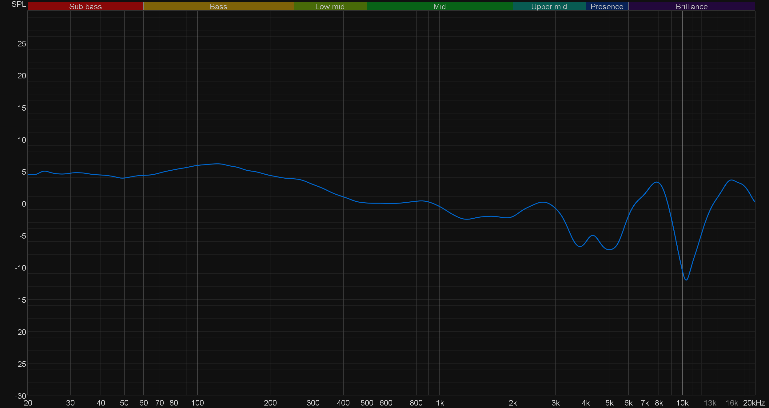 Сразу обращает на себя внимание «провал» примерно от 7 кГц и выше — возможные проблемы со свистяще-шипящими звуками разработчики решили кардинальным образом. Ну что тут скажешь, это сработало. График АЧХ показан на фоне целевой кривой, предоставленной производителем используемого стенда. Она является адаптированным под конкретное устройство аналогом так называемой «кривой Хармана», созданной командой Harman International под руководством доктора Шона Олива.