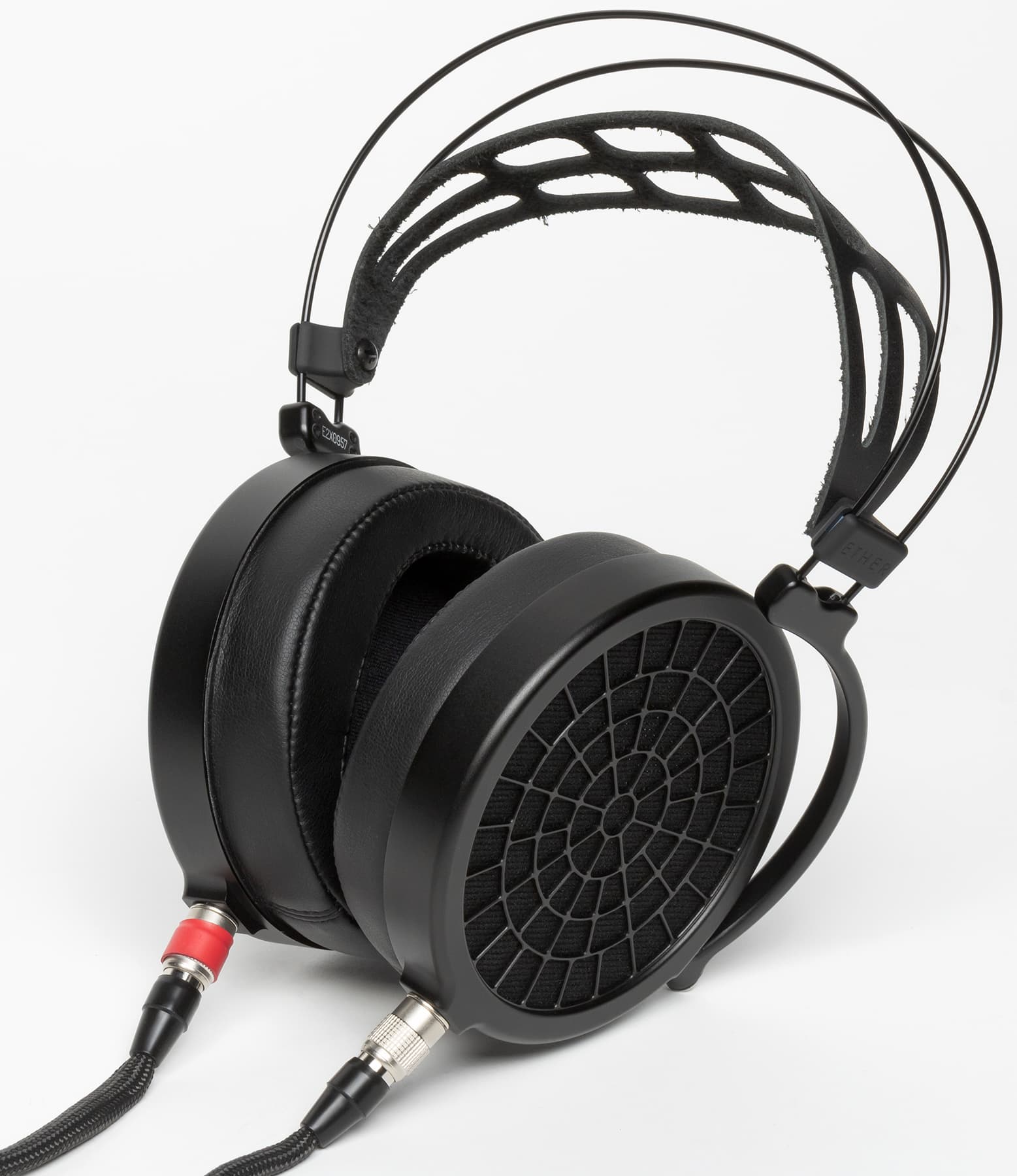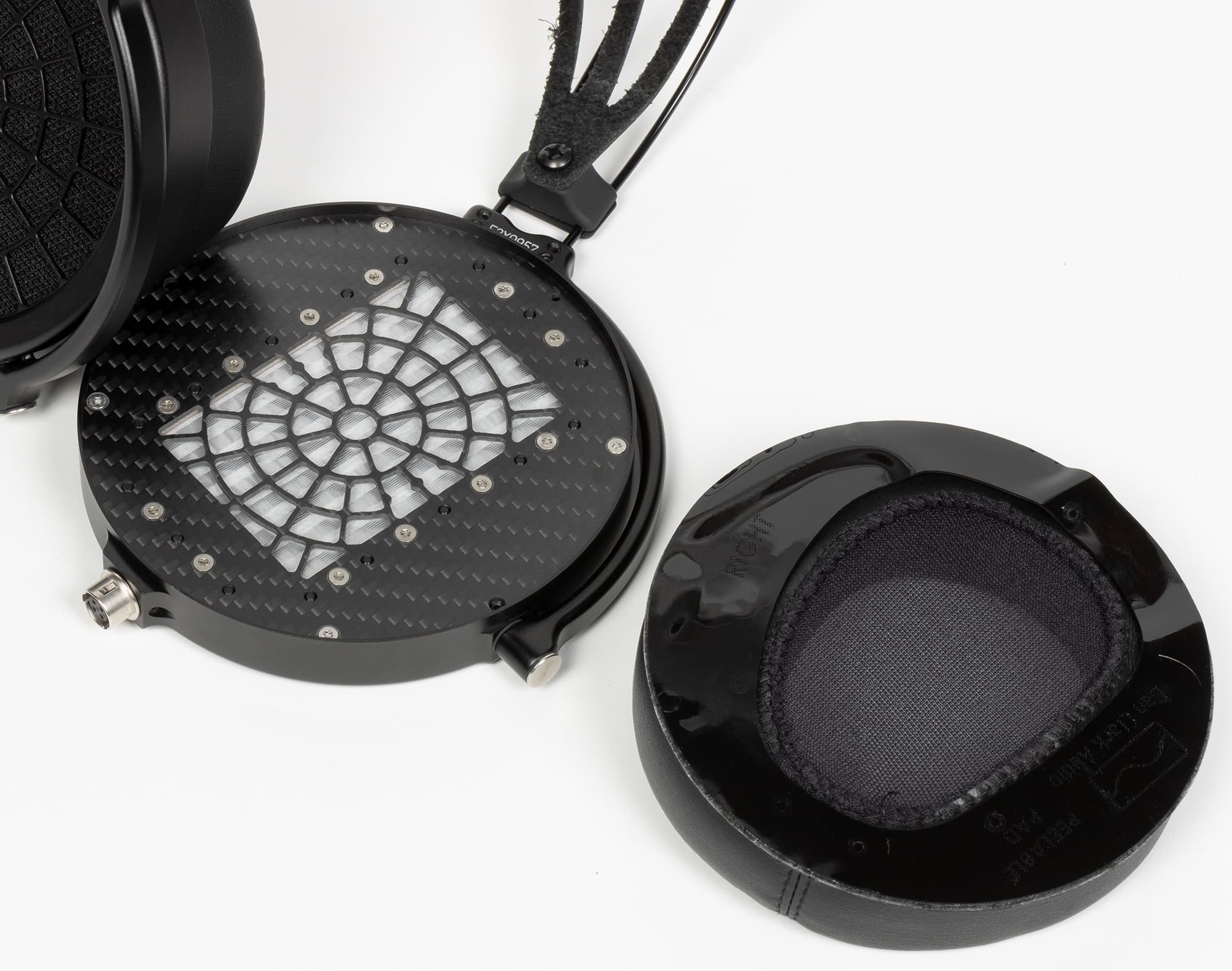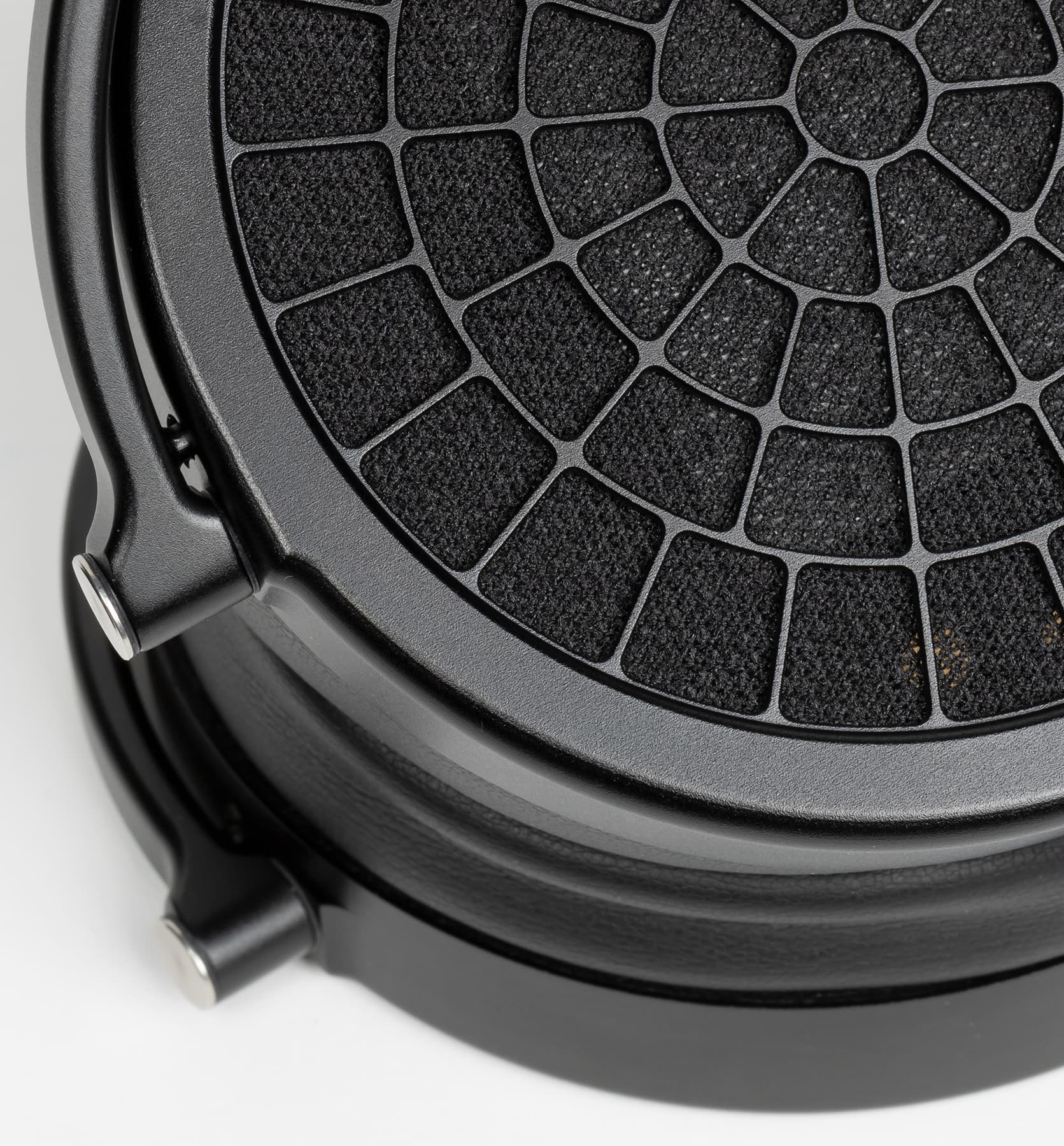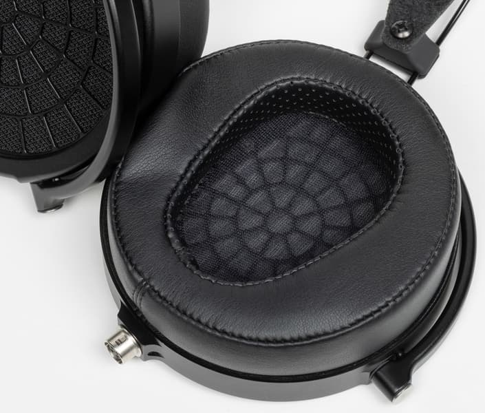 Конструкция у наушников открытая, внешняя часть излучателей прикрыта слоем перфорированного материала и защищена металлической сеткой. Размер драйвера, кстати, составляет 71×45 мм. Диафрагма выполнена из алюминия, что позволило снизить ее массу на 70% в сравнении с драйвером Dan Clark Audio предыдущего поколения. Здесь мы, конечно, вновь цитируем описание производителя.