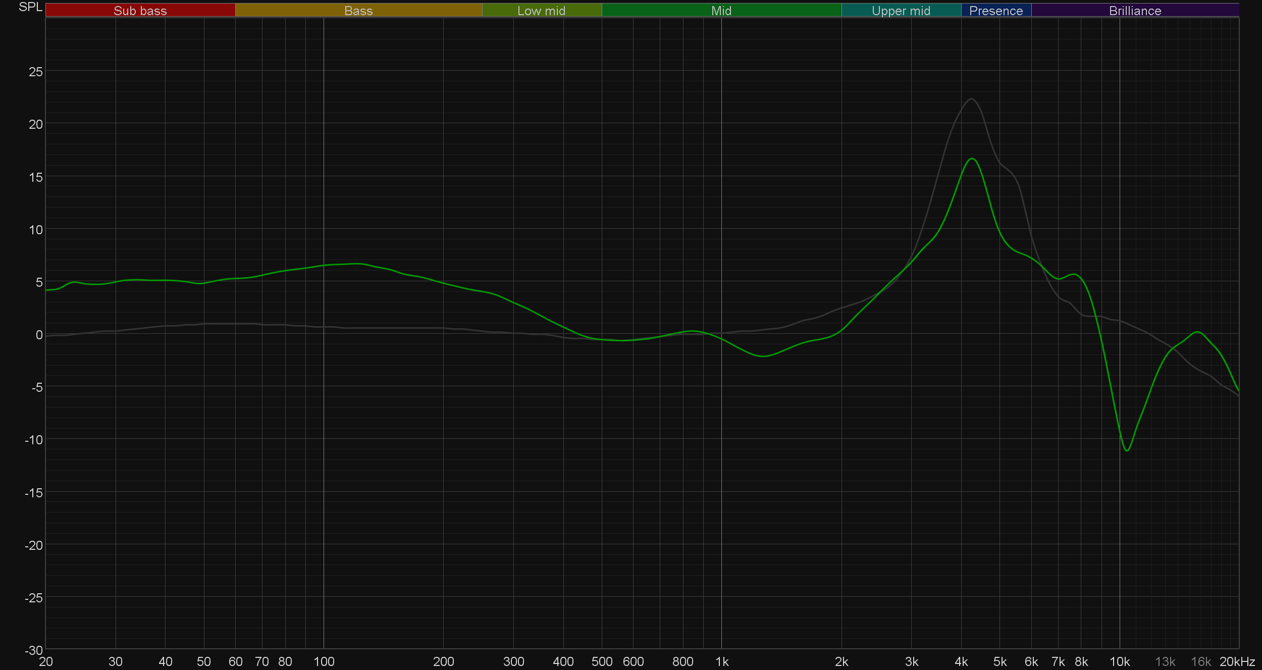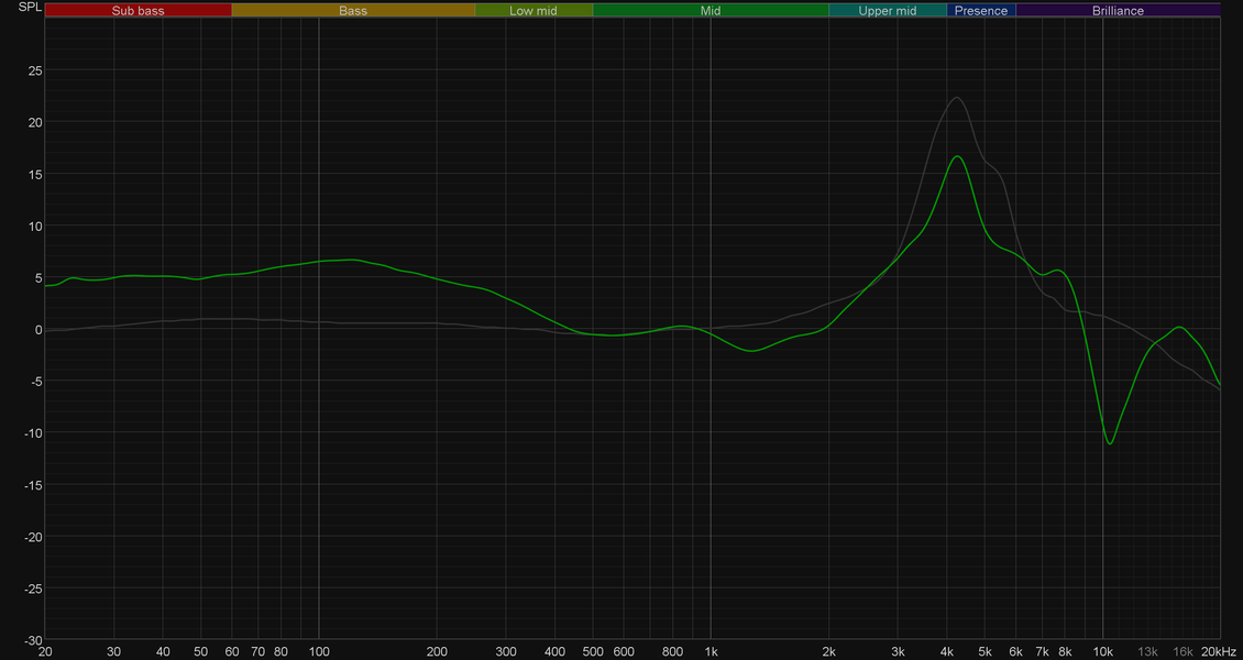 Получилось примерно то же самое, только немного нагляднее. Пик в районе 4 кГц на целевой кривой призван скомпенсировать резонансные явления, возникающие в полости амбушюров наушников при их ношении. В данном случае они оказались не так ярко выражены, потому в районе этой частоты возник видимый «провал», относиться к которому слишком серьезно не стоит. В остальном же график вполне достоверно отражает пользовательский опыт.