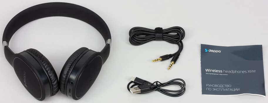 В комплекте, кроме самих наушников, идут кабель на разъем миниджек (3,5 мм) в тканевой оплетке, кабель Micro-USB для зарядки и инструкция пользователя.