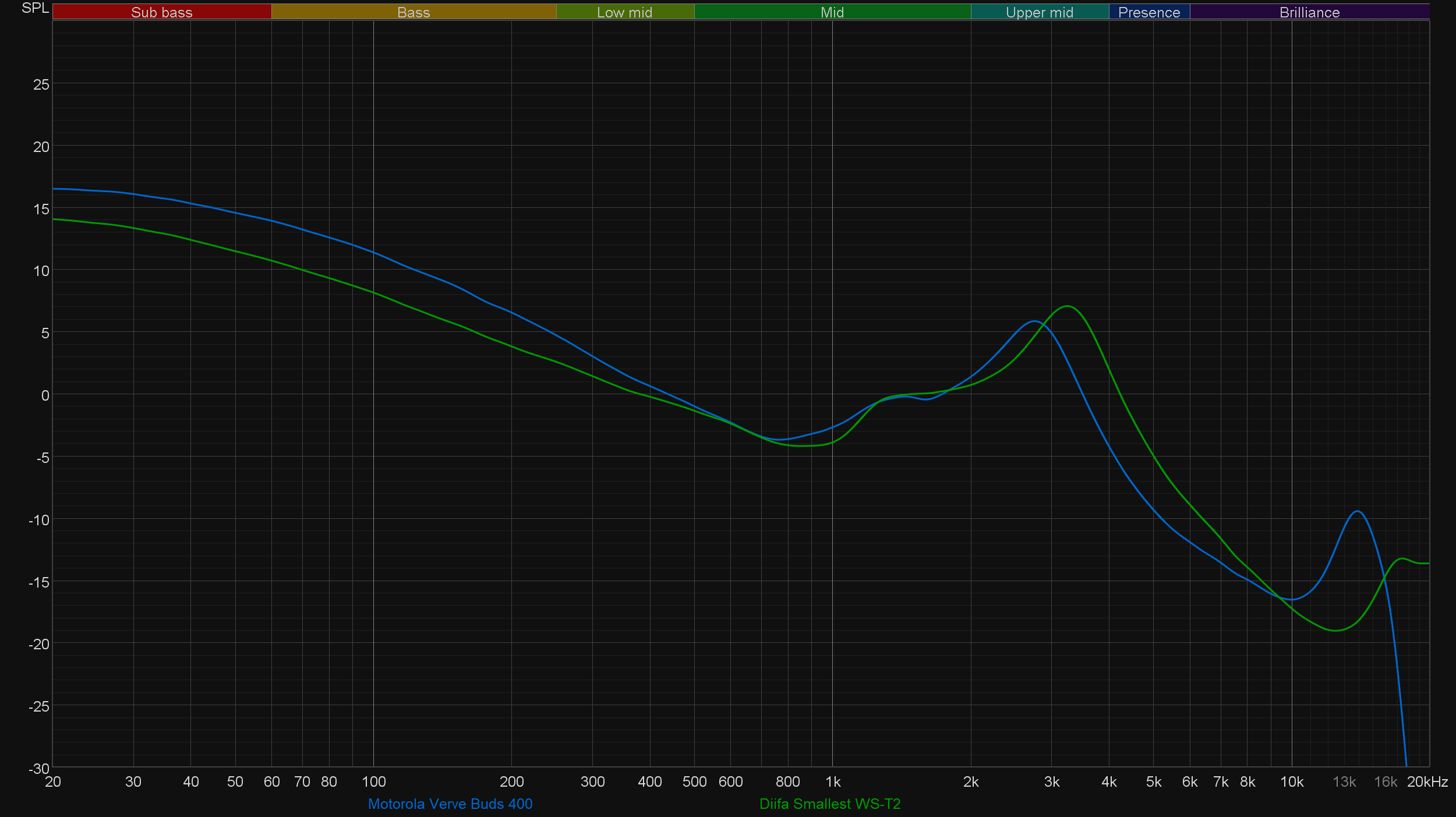 Звучание Diifa WS-T2 имеет те же особенности, что и у Motorola VerveBuds 400, что прекрасно заметно по графикам ниже. Но это как раз тот случай, когда графики не в полной мере отражают опыт прослушивания. И если в обзоре Buds 400 мы предположили, что они вполне подойдут для повседневного прослушивания фоновой музыки, то здесь уже совсем нет такой уверенности.