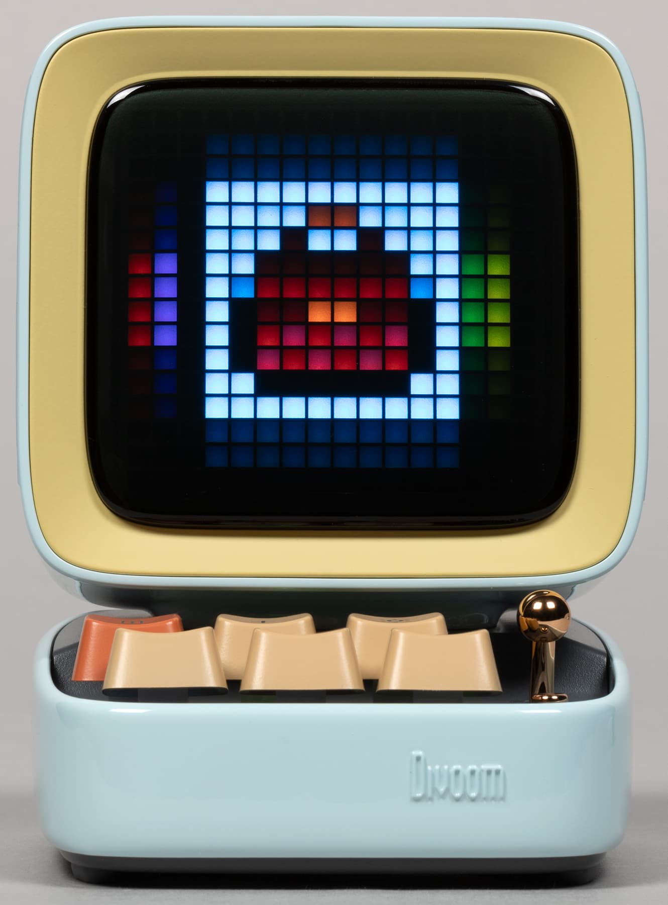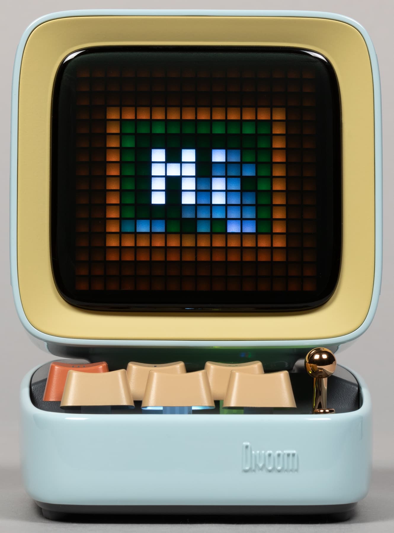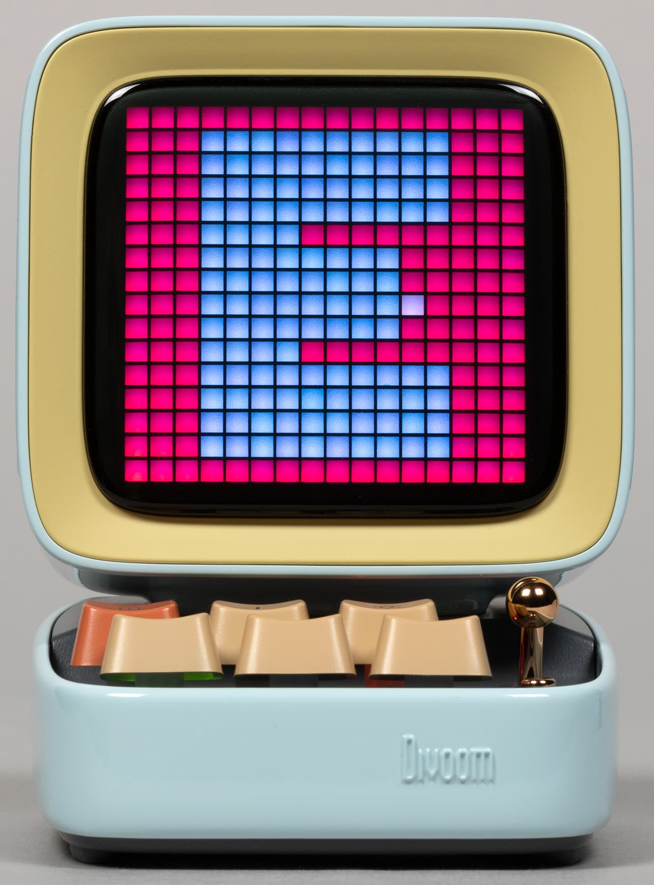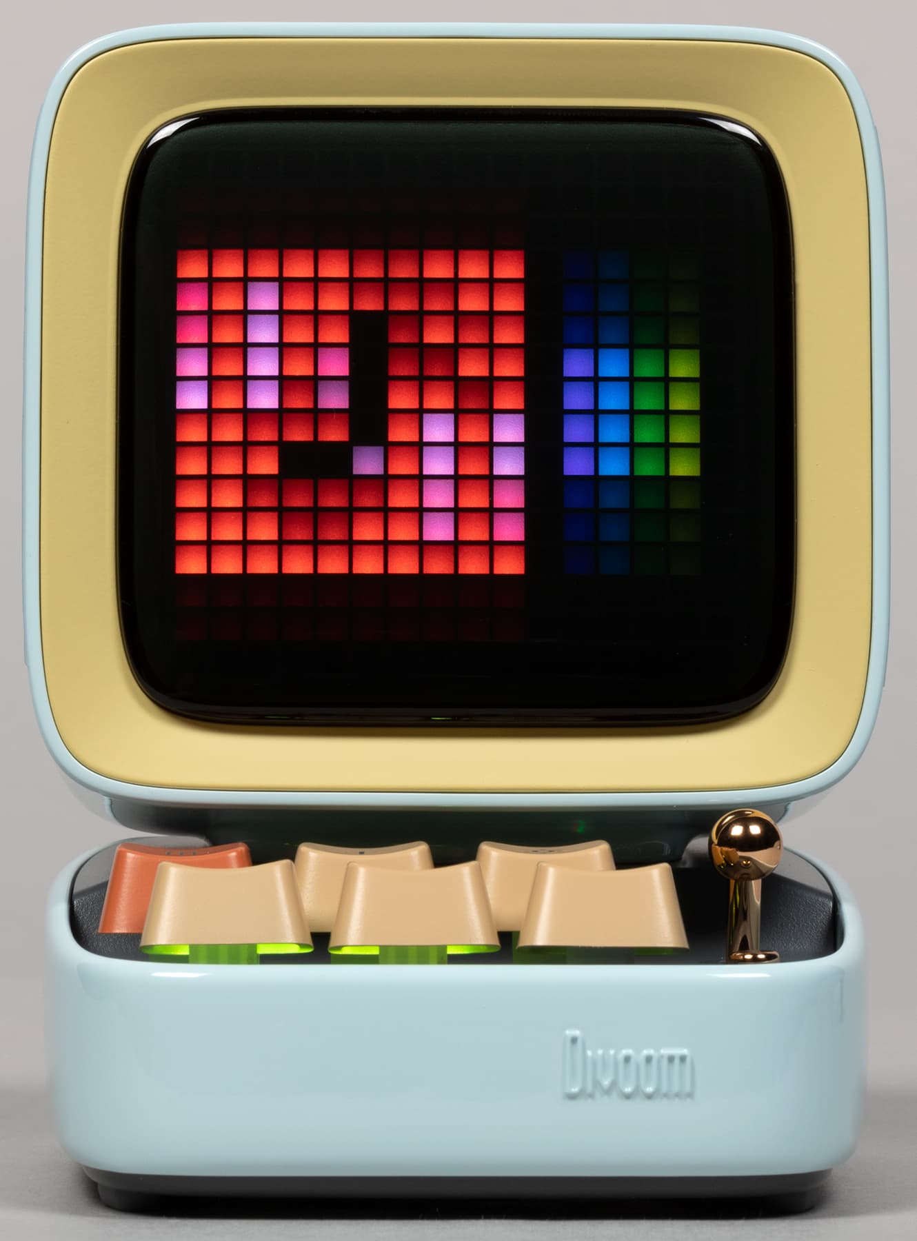 Компания Divoom выпускает кучу всяческих штуковин, оборудованных пиксельными экранами и, соответственно, способных воспроизводить картинки и анимацию в стиле Pixel Art — от дисплеев до рюкзаков и сумок. Ну или вот колонки, например. Да-да, у нашей колонки есть экран, который в данном случае чуть ли не важнее, чем встроенные динамики — основная-то «фишка» именно в нем. А еще в очень оригинальном дизайне.
