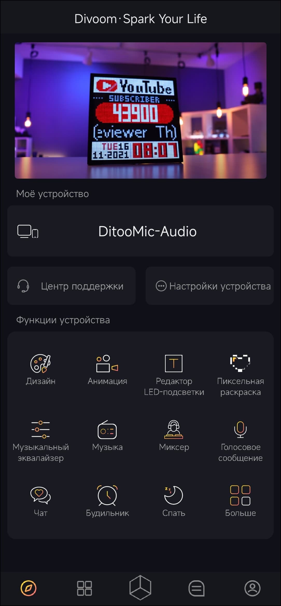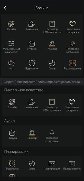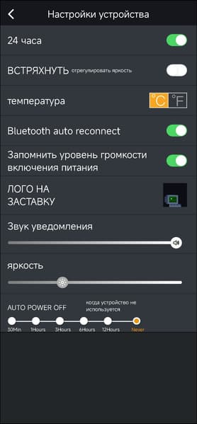 Сообщество у Divoom неожиданно большое, а потому пользовательская галерея изображений просто крайне велика — можно найти самые разные картинки, порой даже слегка неожиданные. На вкладке настройки устройства есть возможность активировать изменение яркости встряхиванием, выбрать шкалу измерения температуры, сменить заставку и так далее — все опции видны на скриншоте.