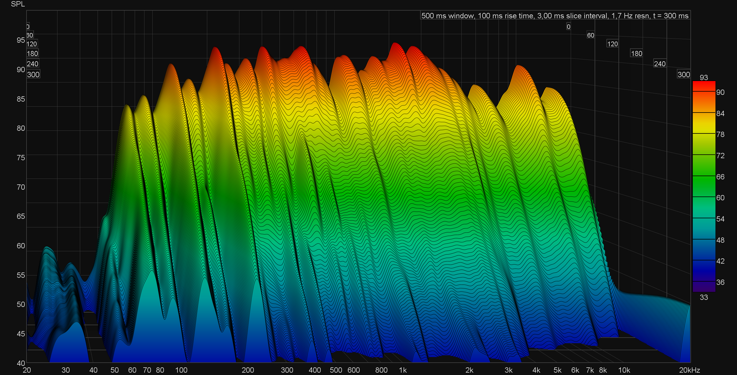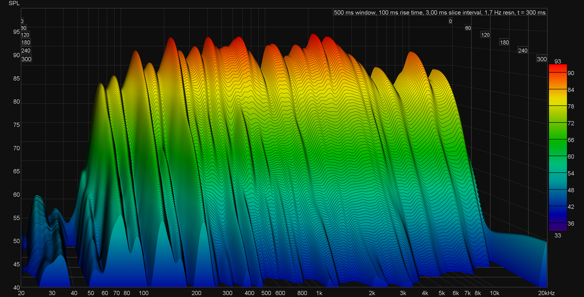 На графике кумулятивного затухания спектра (он же «водопад» или waterfall) хорошо видно, что фазоинвертор действительно работает, причем настроен на частоту примерно 80 Гц, как и у большинства других портативных колонок, которые нам доводилось тестировать.