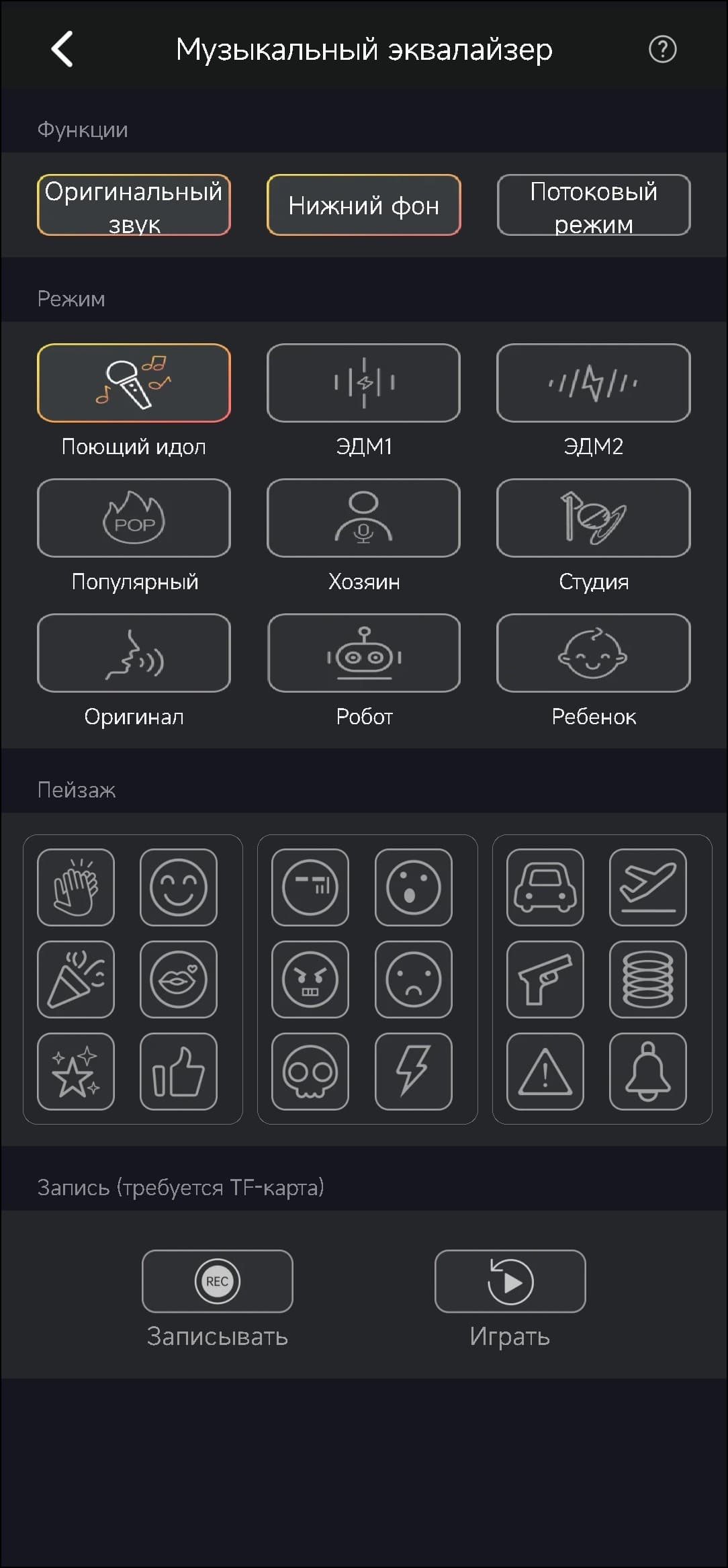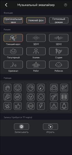 Ну и, конечно, можно воспроизводить звук. Вот тут просто куча всего интересного. Во вкладке «музыкальный эквалайзер» собраны варианты настройки микрофона. Можно добавить на него реверберации, а также сделать себе голос ребенка или робота. А потом, нажимая на кнопки в нижней части, добавлять ко всему этому всяческие фоны — смех зала, например. В общем, отличный набор для юного и не очень стендапера.