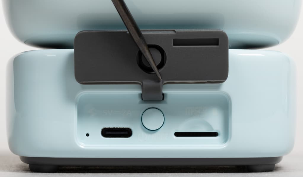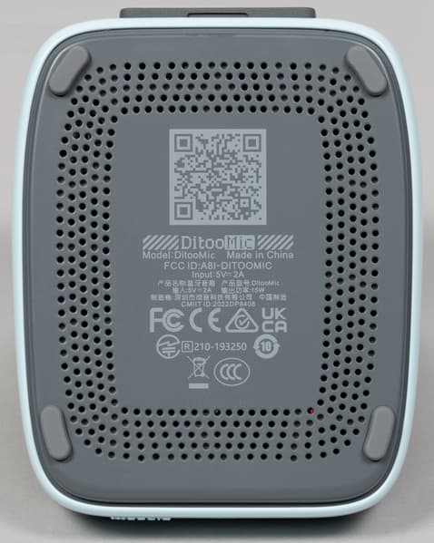 Сзади расположено щелевидное отверстие фазоинвертора, который тут тоже имеется, несмотря на то, что по внутреннему объему Divoom DitooMic чуть больше кружки с чаем. Панель с разъемами и кнопкой включения закрыта силиконовой накладкой.