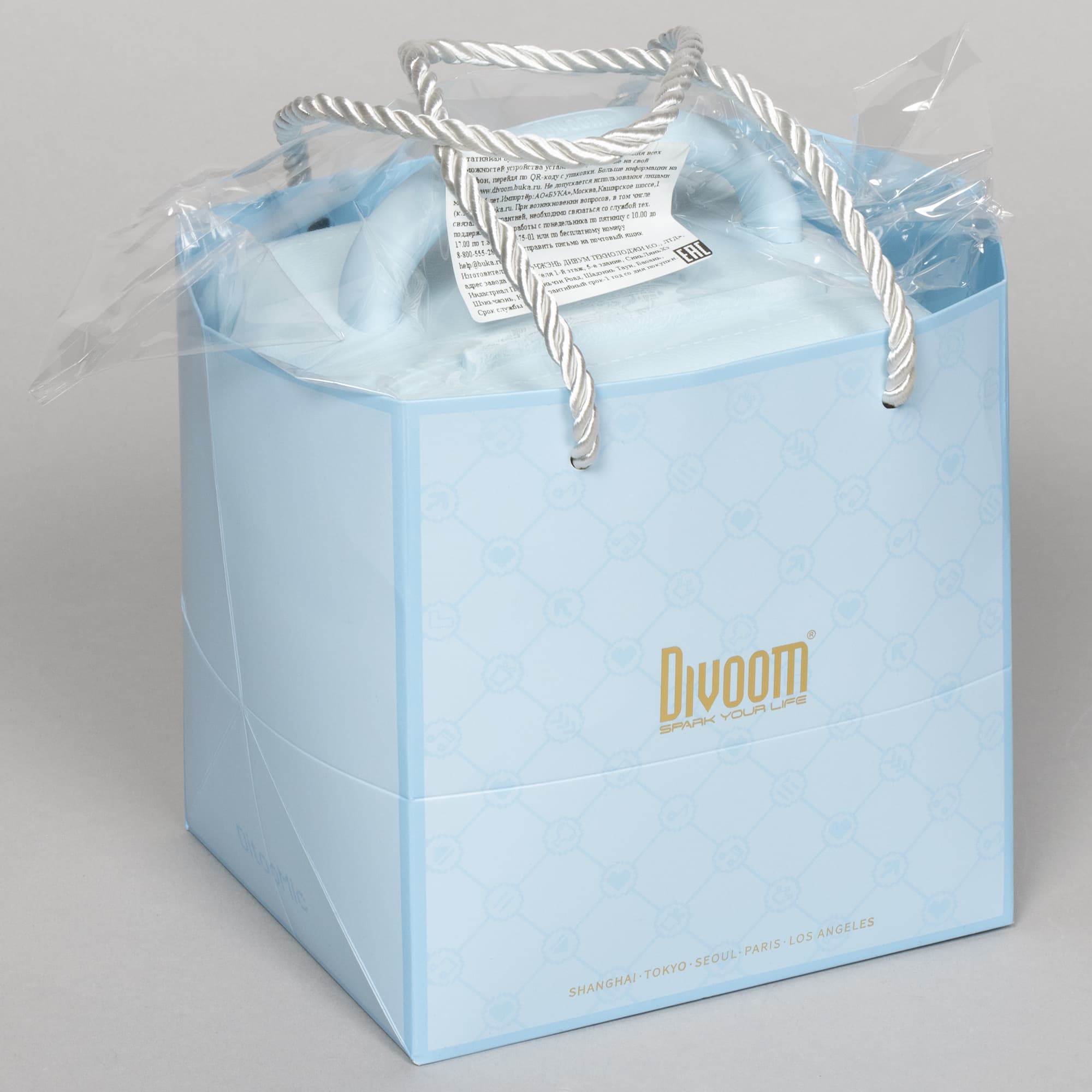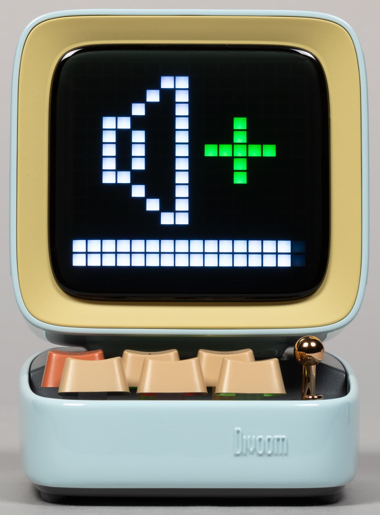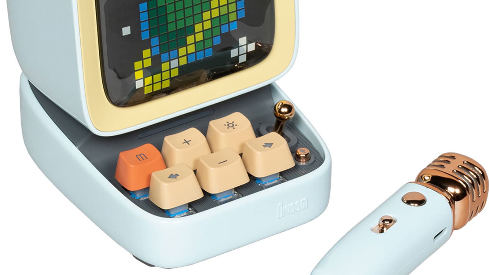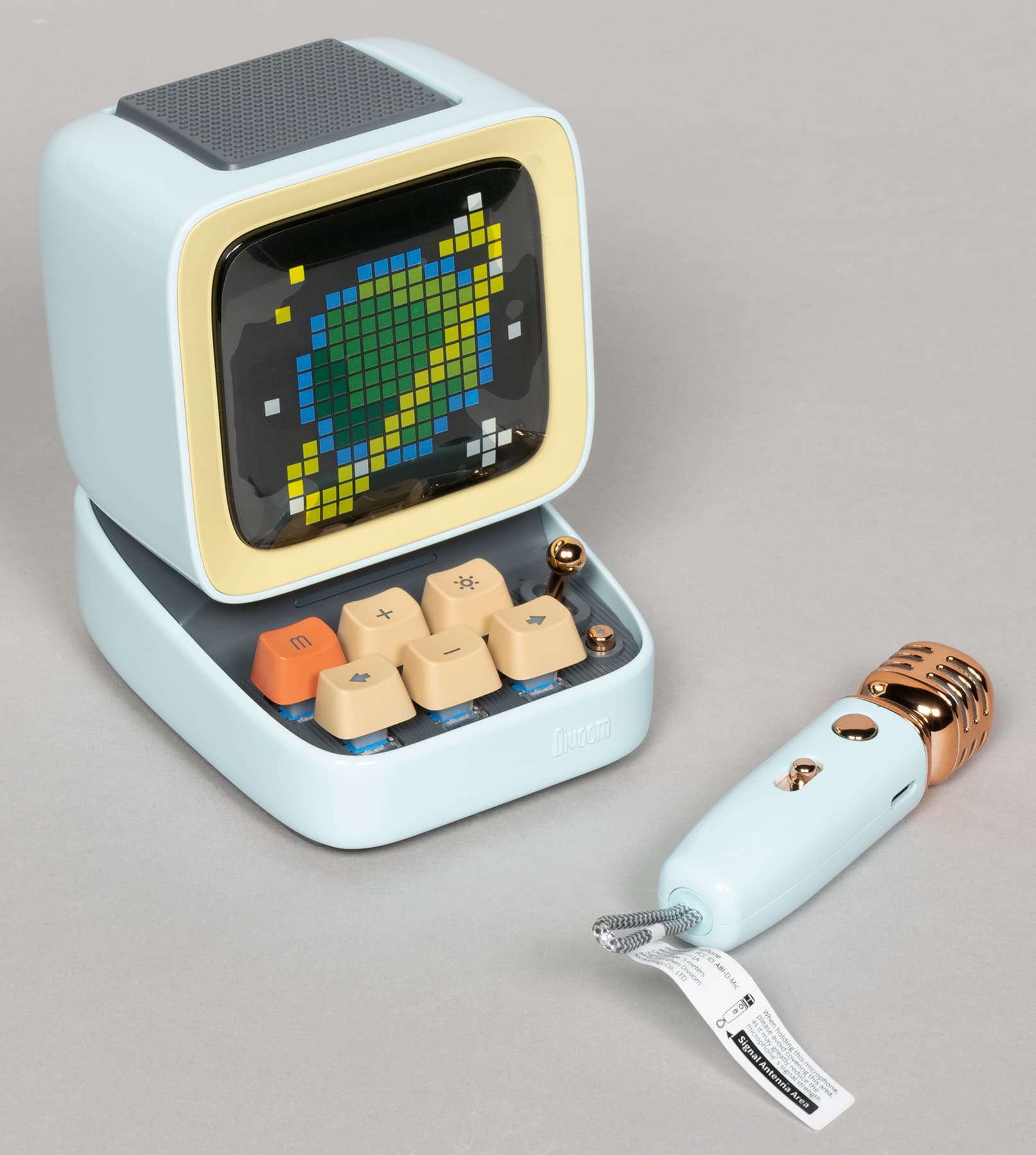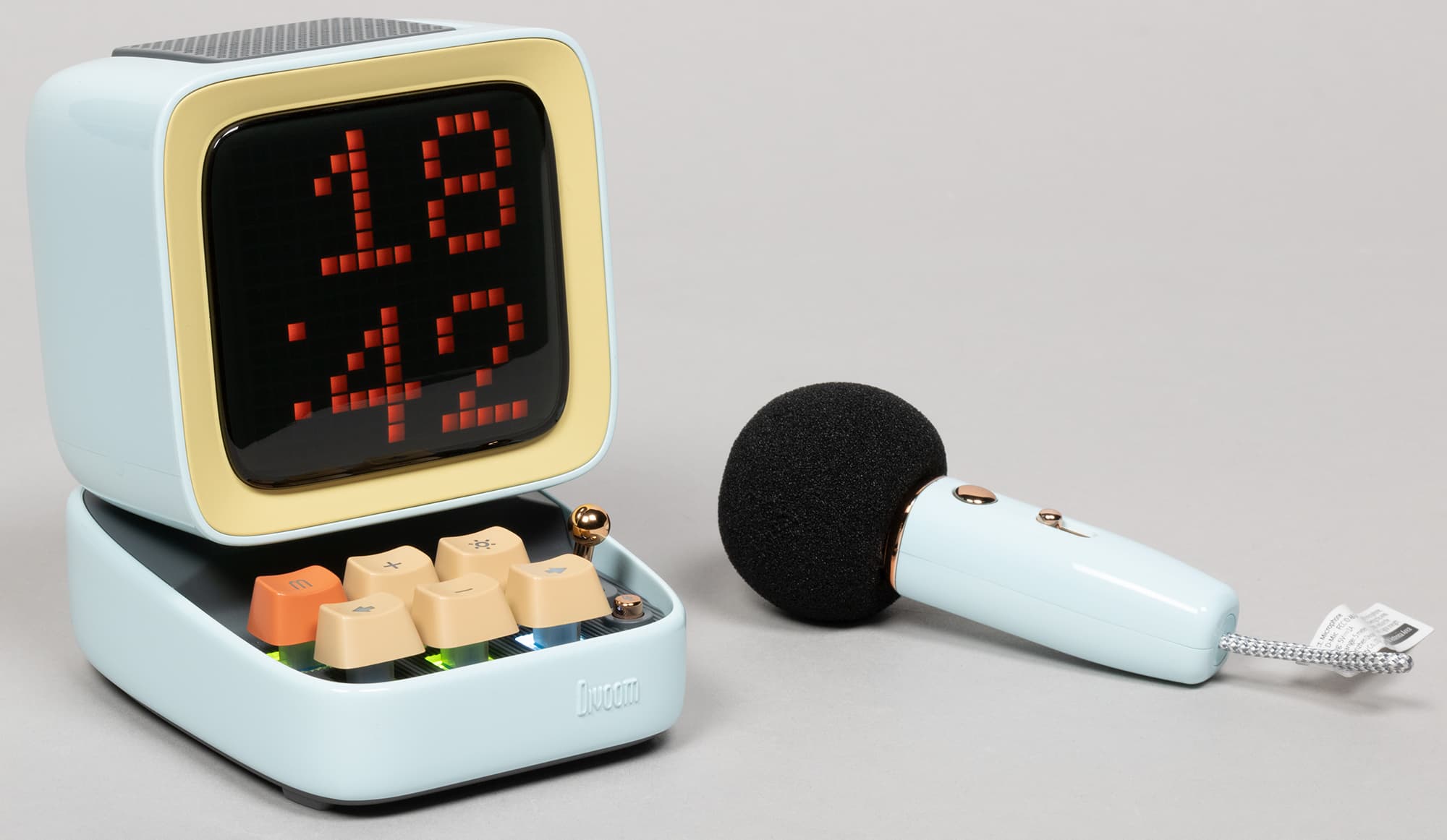В продаже доступны комплекты из колонки с микрофоном в трех цветах: голубом, зеленом и розовом. У нас на тестировании был первый. Отдельно колонку под именем Divoom Ditoo Pro также можно приобрести в черном и белом исполнении.