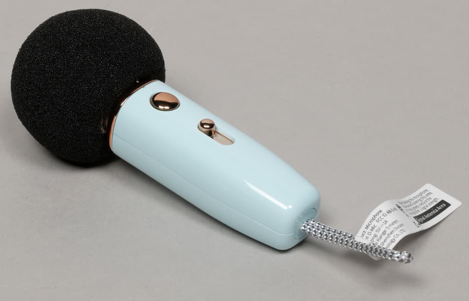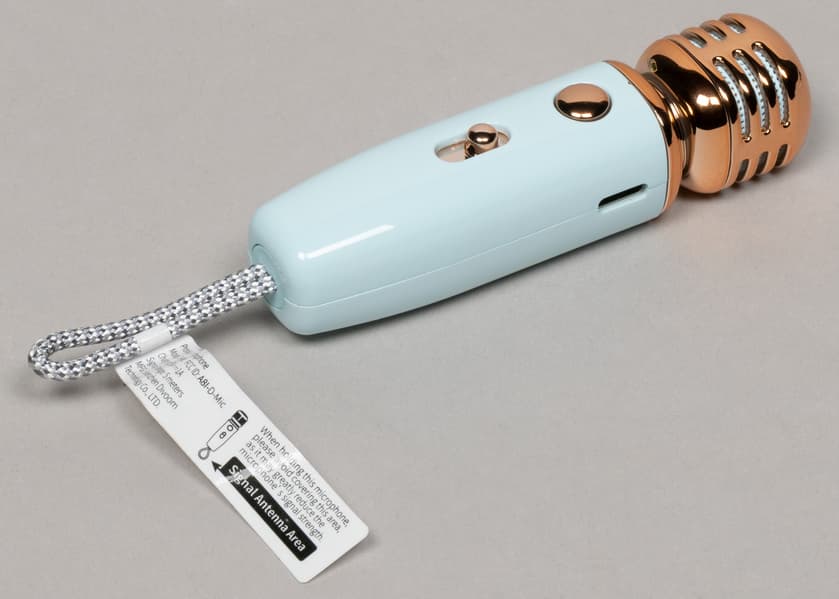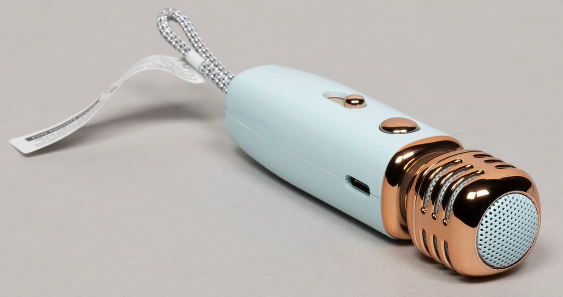 Микрофон очень маленький, оснащен портом для зарядки и парой элементов управления. Золотисто-бронзовый цвет некоторых деталей делает его очень заметным и совсем уж похожим на игрушку, что не всегда и не для всех будет хорошей новостью.