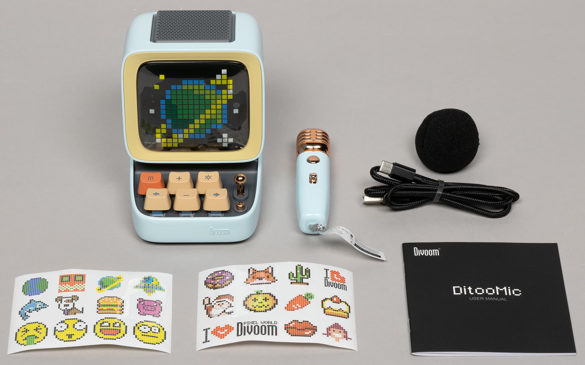 В комплект поставки входят сама колонка, маленький микрофон для караоке, ветрозащита к нему, кабель USB-A — USB Type C длиной 80 см для зарядки, инструкция и комплект наклеек (с иллюстрациями в стиле пиксель-арт, естественно).