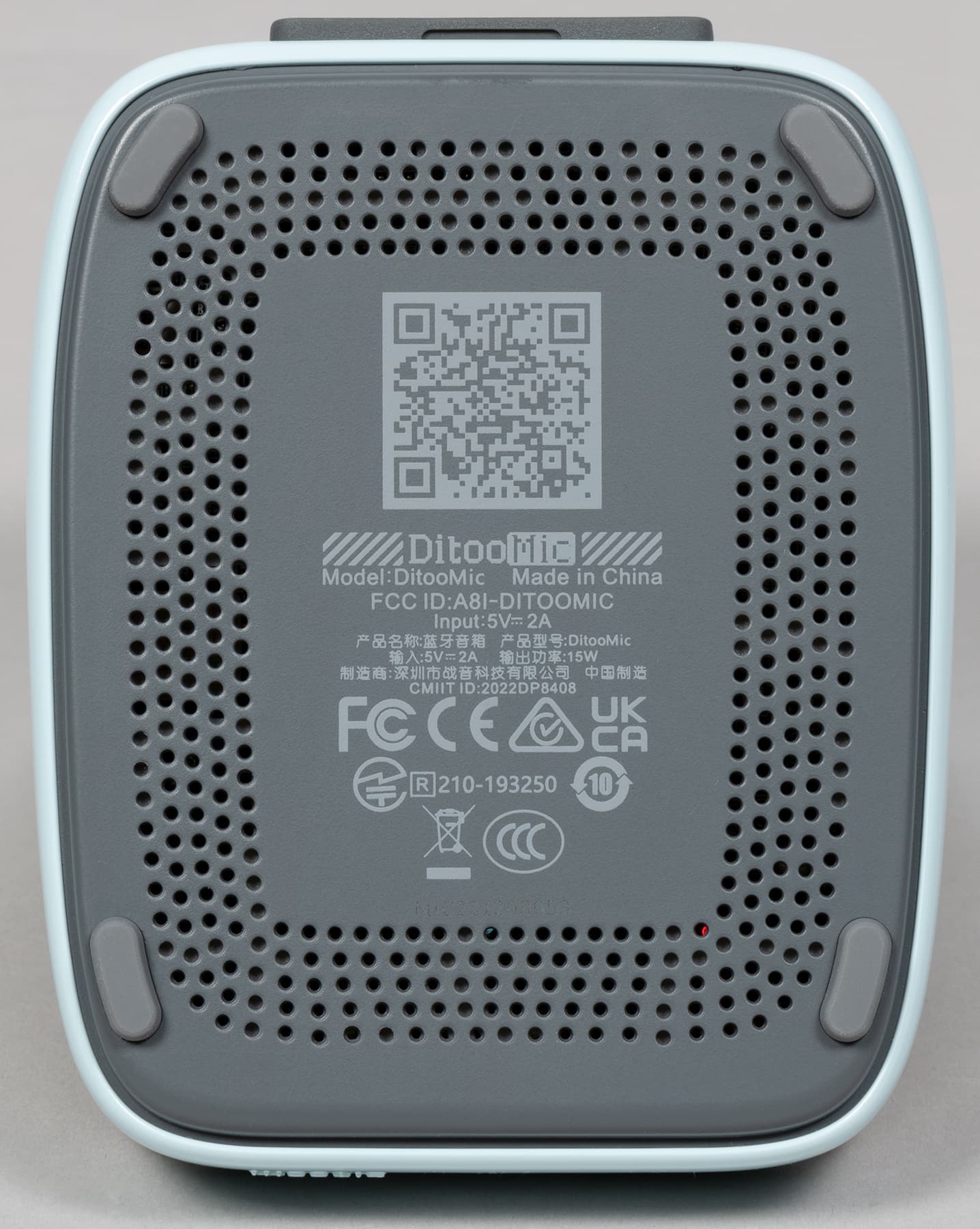 Снизу размещена решетка для охлаждения. Колонка, кстати, умеет неплохо так нагреваться, что немного удивительно. Также на дне мы видим небольшие силиконовые ножки, краткую техническую информацию и QR-код, ведущий на страницу скачивания ПО для управления устройством.