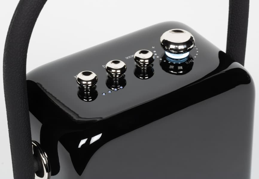 Органы управления колонкой сосредоточены на верхней панели. Слева находится регулятор громкости — валкодер без ограничения угла вращения с возможностью нажатия. Далее мы видим три кнопки. Нажимаются они с усилием чуть выше среднего и довольно резким кликом — стилизация «под ретро» ощущается и здесь.