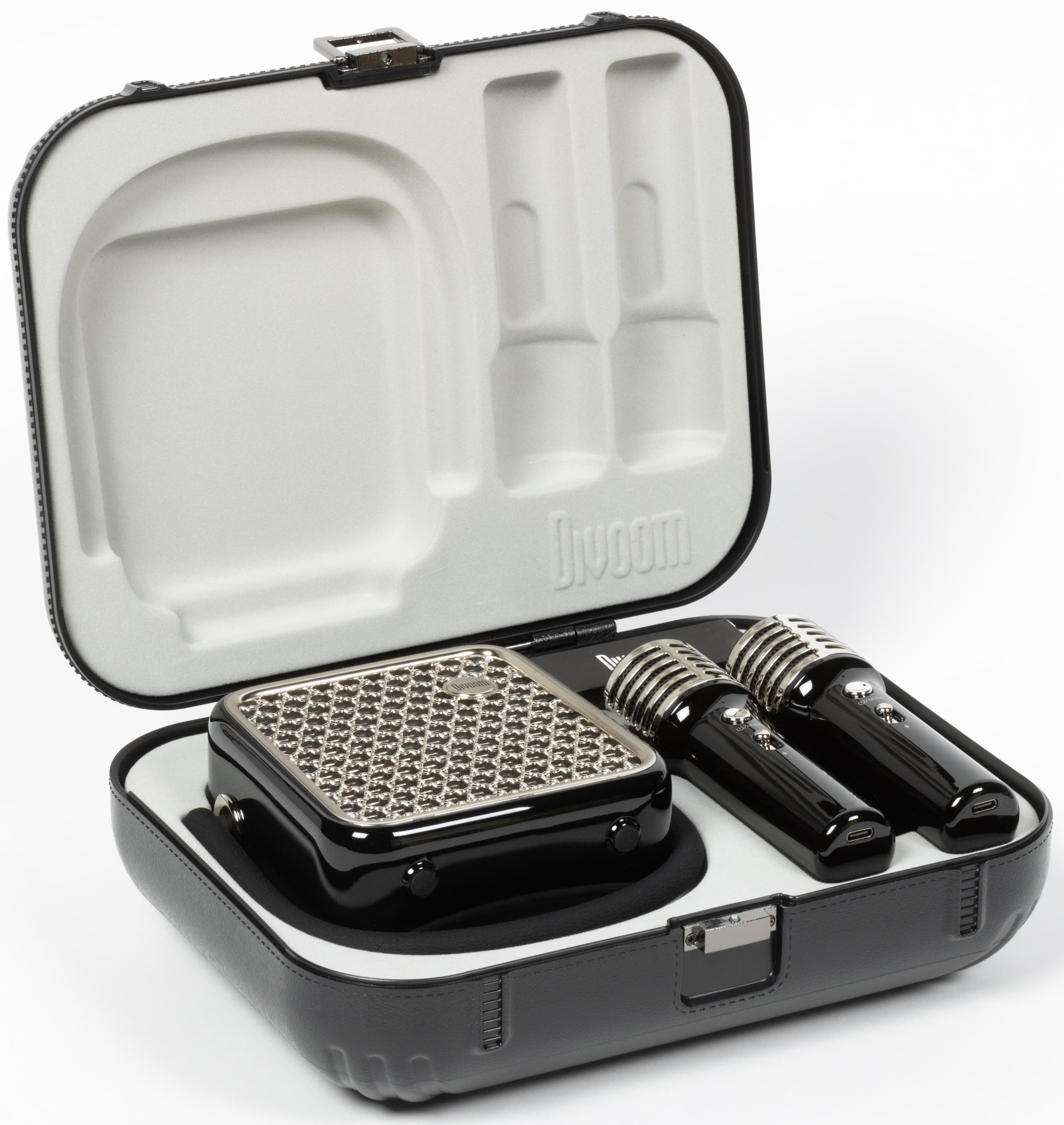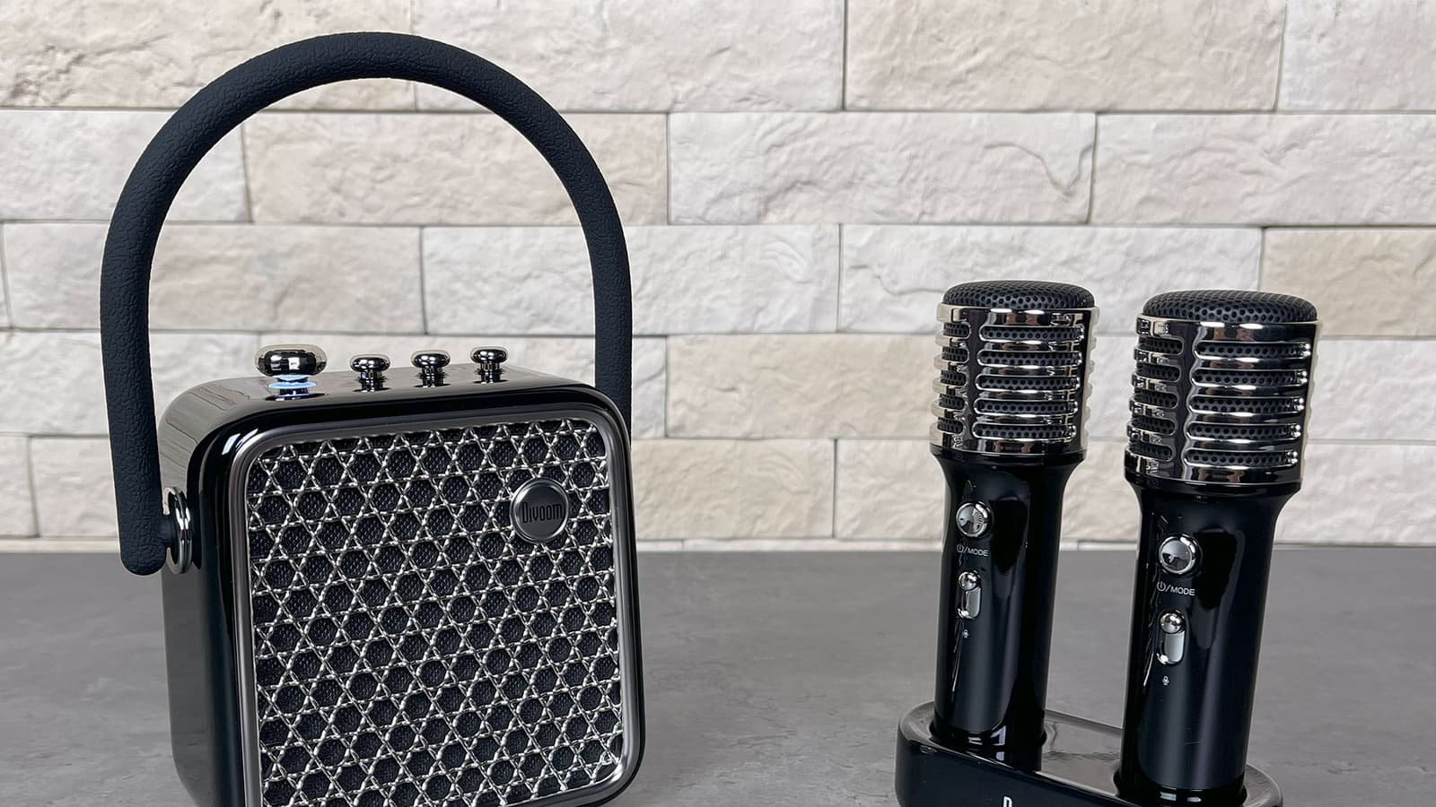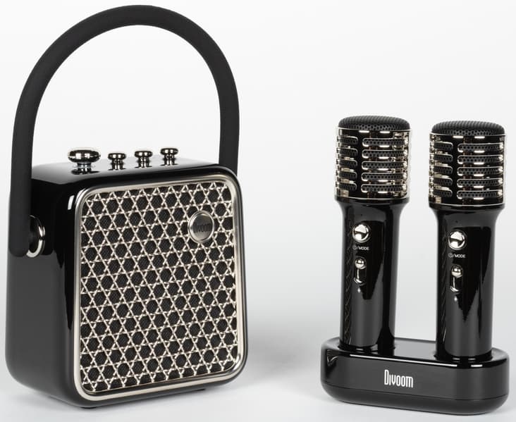 Кейс для переноски можно убрать куда-нибудь в ожидании следующей поездки на вечеринку к друзьям, микрофоны аккуратно разместить в док-станции, колонку поставить рядом — красота. Divoom Songbird-SE предлагается в трех цветах: лавандовом, лимонном и черном. У нас на тестировании был последний вариант.