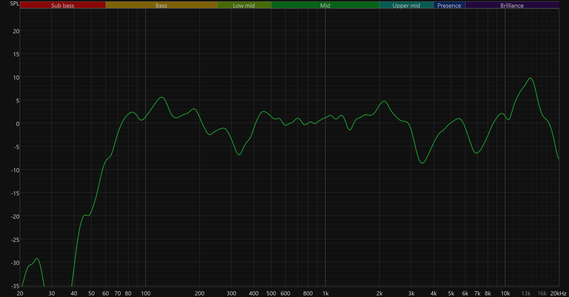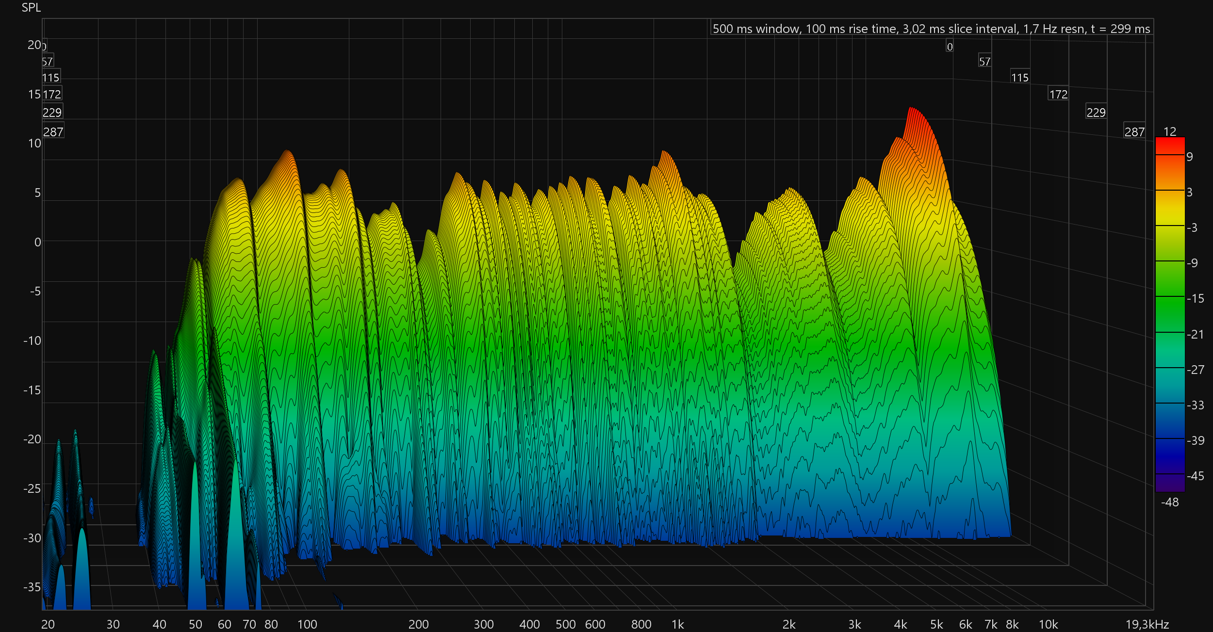 По графику кумулятивного затухания спектра (он же «водопад» или waterfall) хорошо заметно, что легкий пластмассовый корпус основательно вибрирует даже на средней громкости — именно вибрации мы обязаны пиками в самой нижней части спектра.