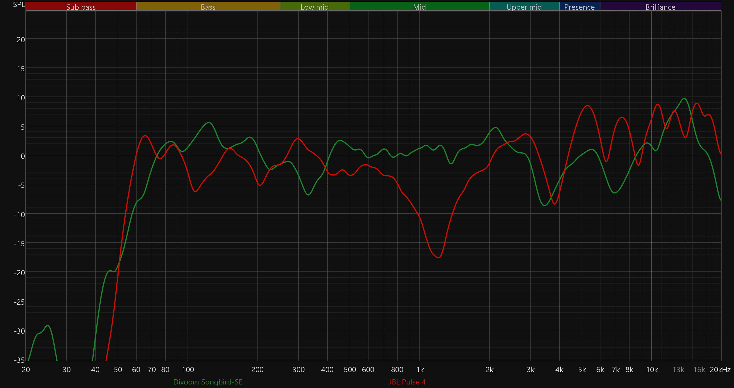 Ну и под конец вернемся к тому, с чего начинали — особенностям звучания портативной акустики с пластиковым корпусом в целом и Divoom Songbird-SE в частности. Сравнение с другими знакомыми нам устройствами Divoom в данном случае не имеет смысла: там и размеры поменьше, и конструкция в силу наличия экрана отличается сильно. При этом колонок с действительно похожей конструкцией в наших тестированиях пока не было, потому подберем устройства с сопоставимой массой и внутренним объемом. Дополнительно комментировать каждый график не будем, просто отметим, что свои особенности есть в звуке всех колонок: какая-то выигрывает в плане «ровности» подачи баса, где-то чуть детальнее звучит середина... Идеал пока не достигнут.