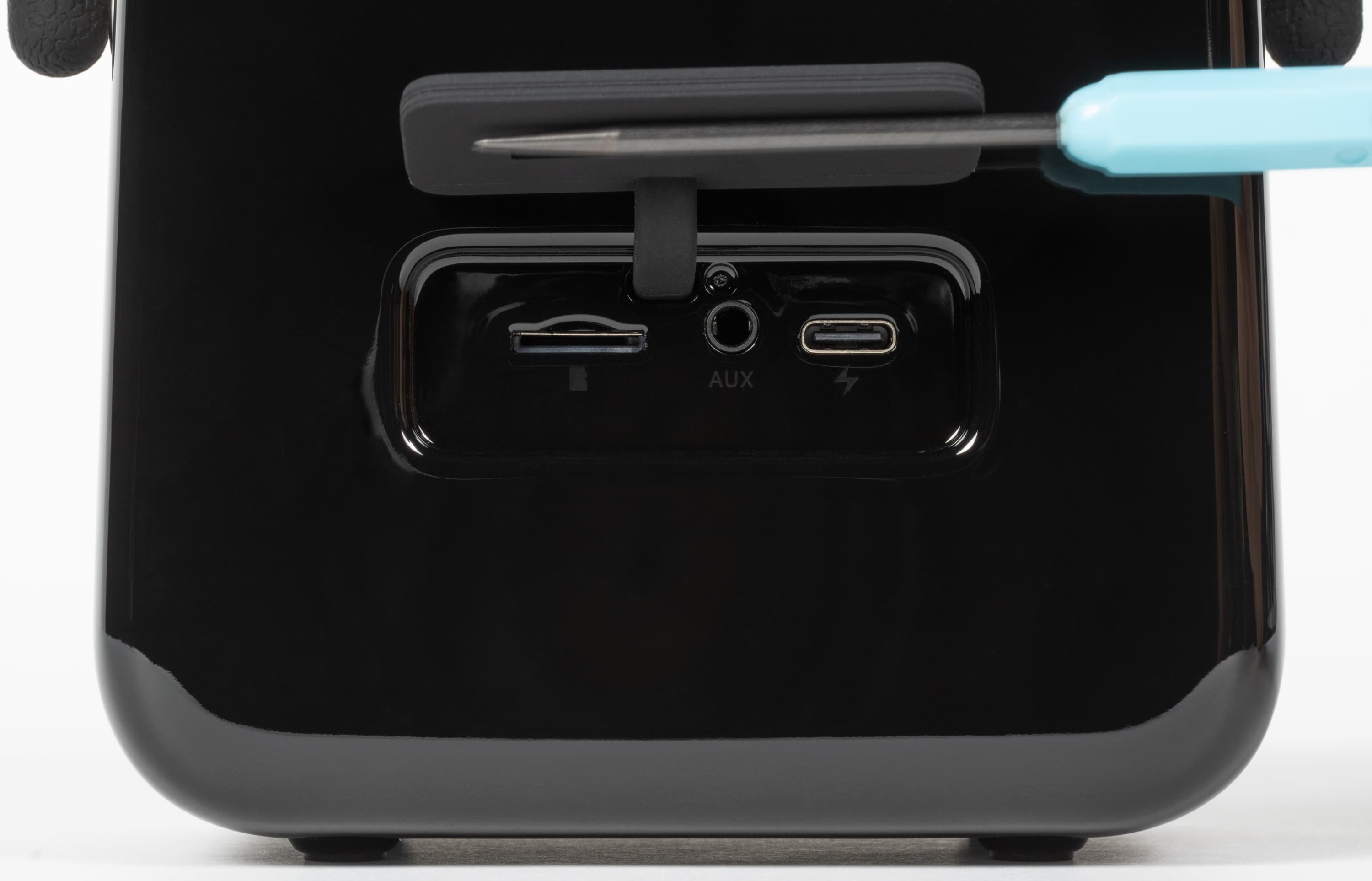 Поддерживаются накопители емкостью до 32 ГБ, при помещении карты в слот устройство автоматически активирует встроенный плеер. Заявлена только поддержка MP3, но в ходе тестирования колонка также воспроизвела файлы в формате WAV. Разъем Aux служит для аналогового подключения к внешним источникам, включается соответствующий режим также автоматически при втыкании коннектора в разъем.