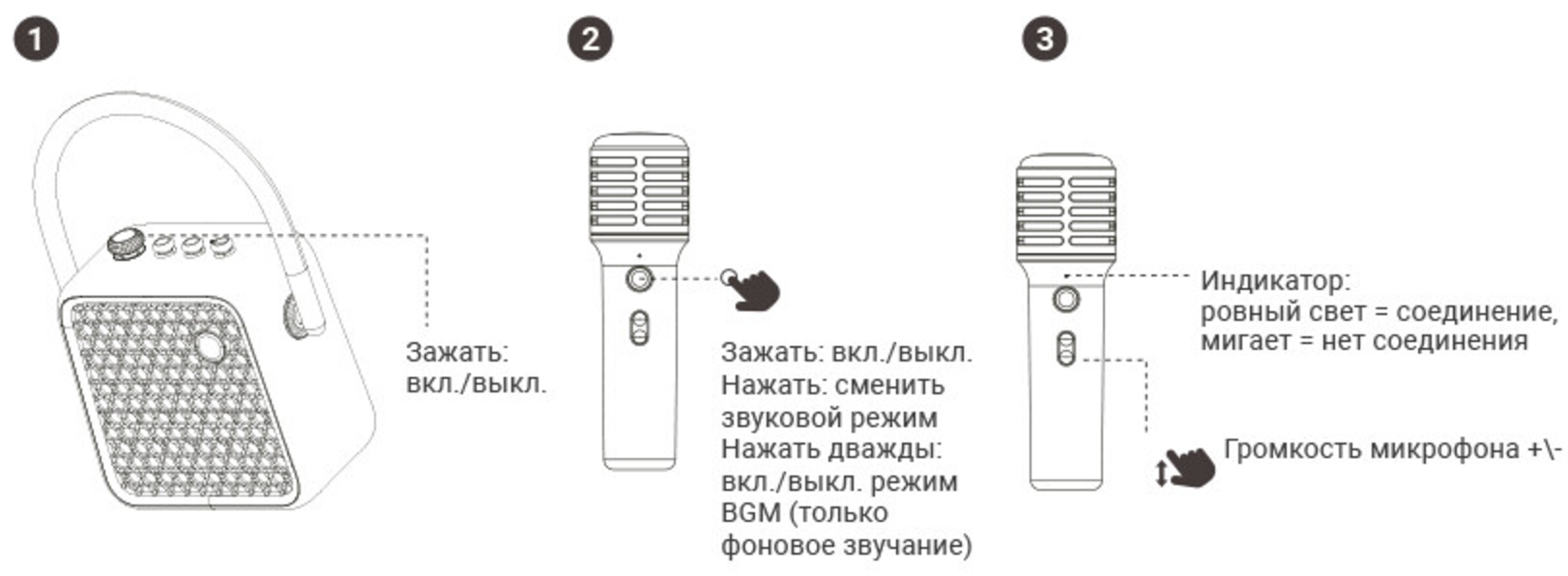 Вновь обратимся к иллюстрации из инструкции, чтобы наглядно показать предназначение всех элементов панели управления. Громкость микрофона изменяется исключительно регулятором на его корпусе и не зависит от выставленного общего уровня. В целом, если колонка оставляет ощущение более-менее солидного устройства, то микрофон — по ощущениям всё же игрушка.