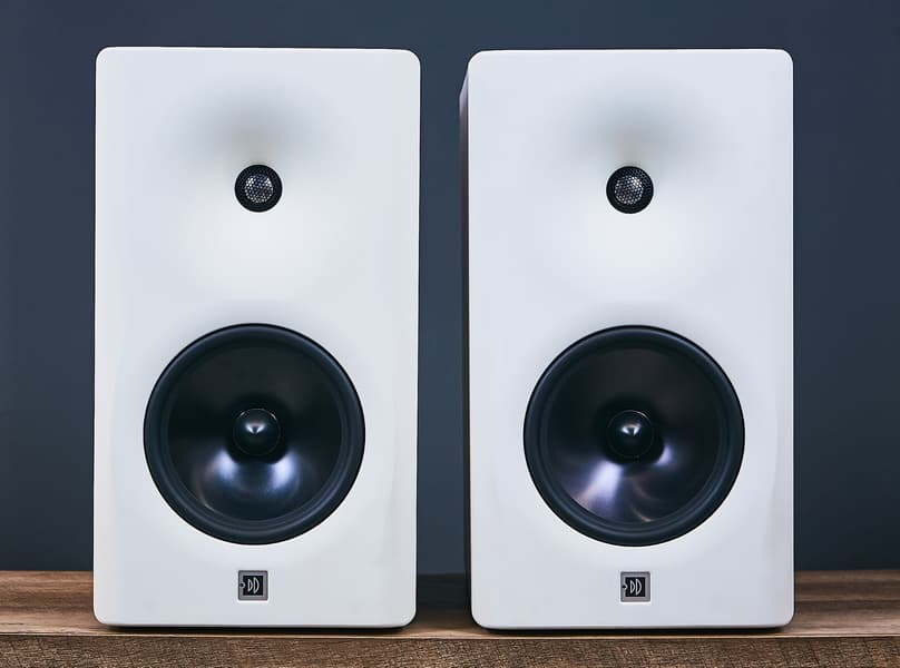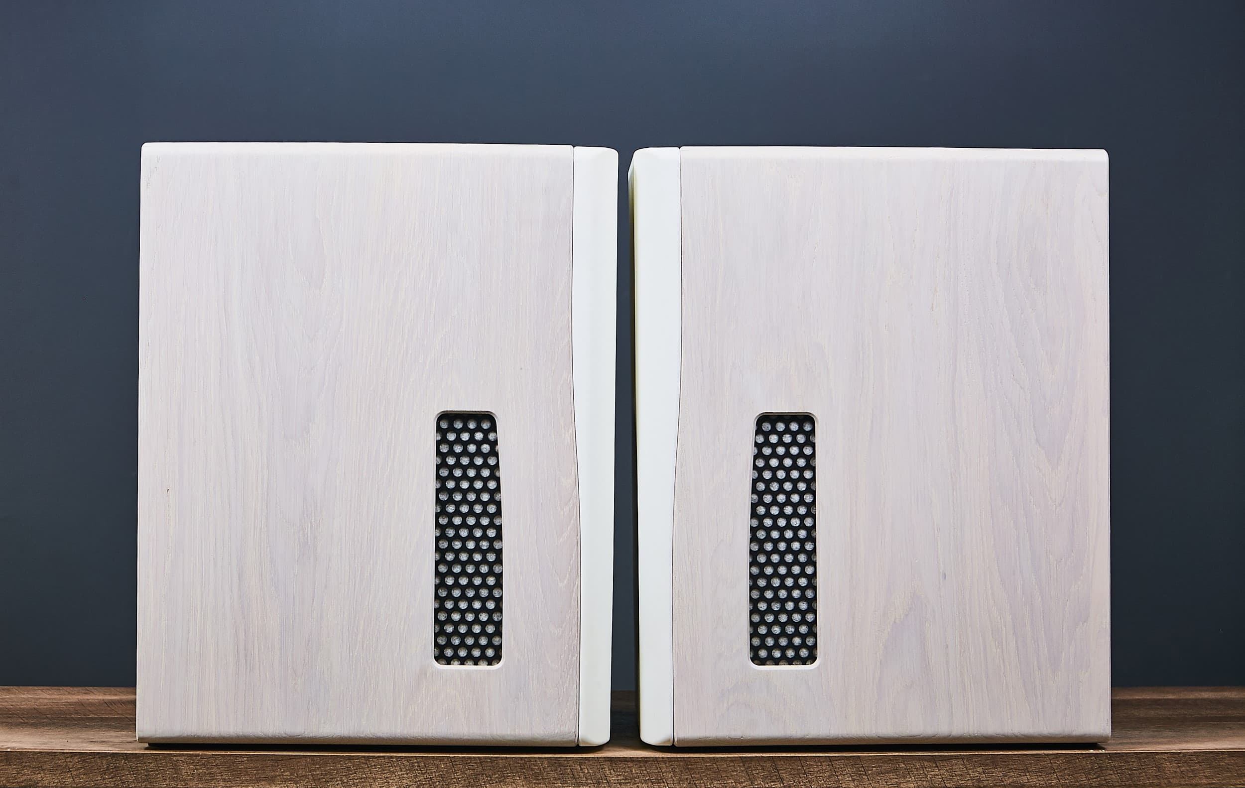 Dutch & Dutch 8c могут быть выполнены в четырех цветовых решениях: белый/натуральный, черный/натуральный, черный/коричневый и черный/черный. Первым в каждой паре указан цвет передней панели из ABS-пластика, вторым — цвет отделки из массива натурального дуба толщиной 19 мм, под которым скрывается 18 мм березовой фанеры. Мы тестировали первый вариант, сочетающий белую панель и дубовую отделку без дополнительной окраски.